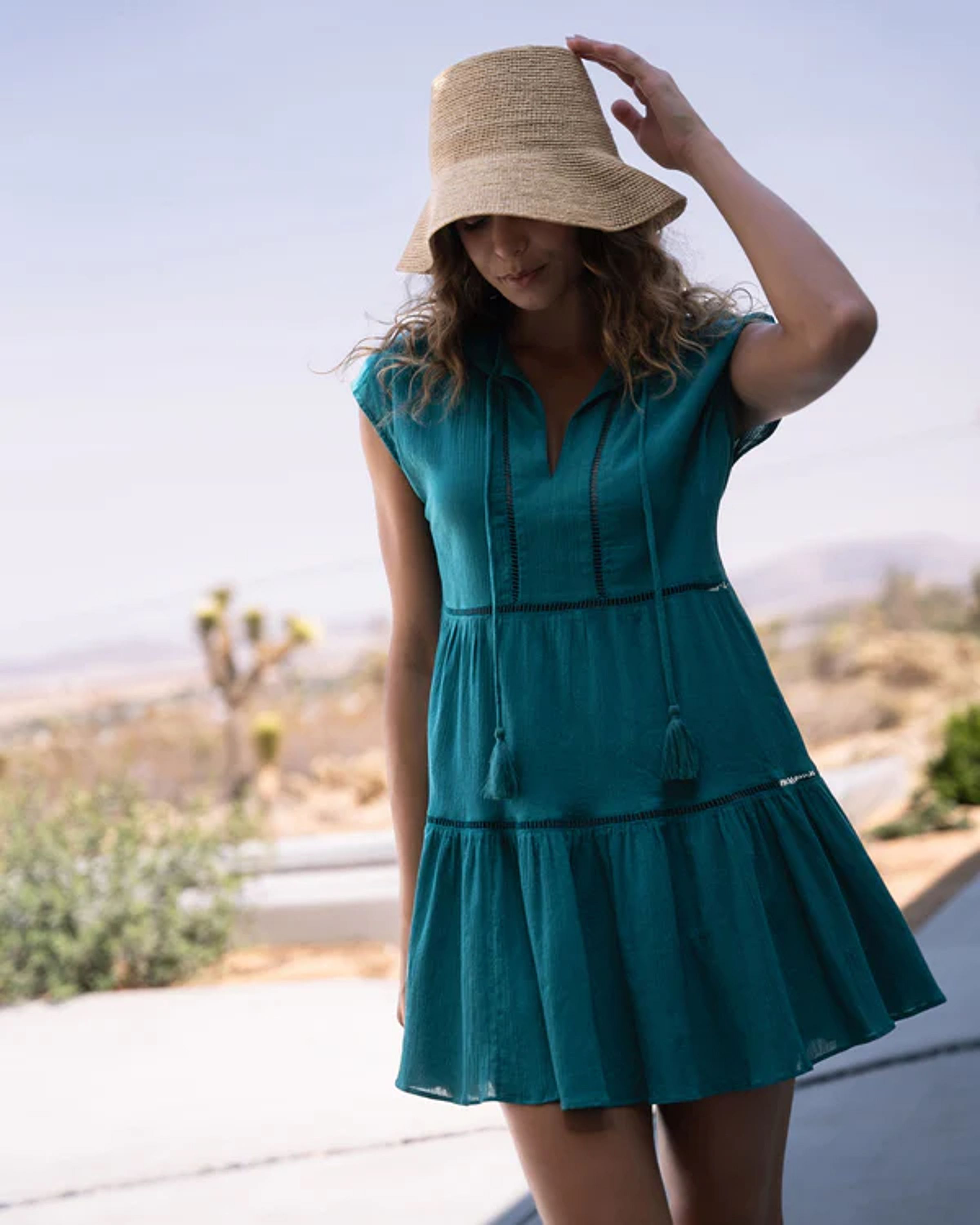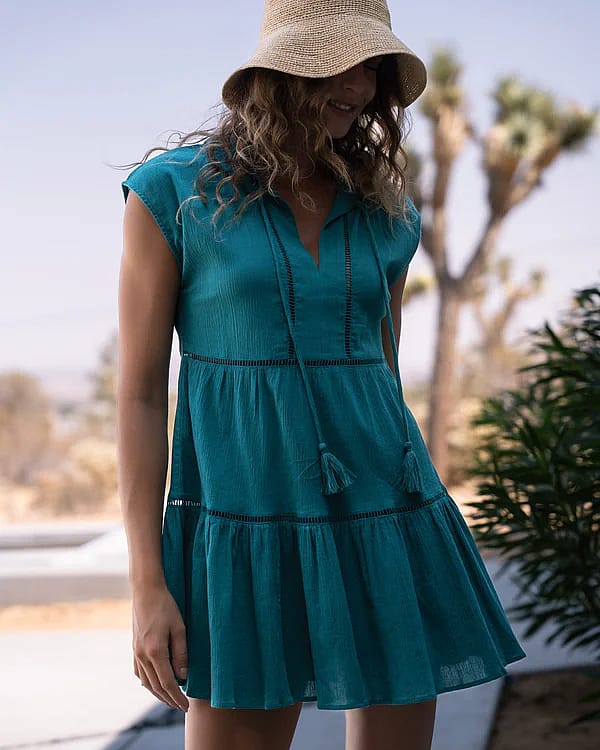 Our Gari dress has a breezy, tiered silhouette perfect for slipping on and off over your swimsuit. It's cut from airy cotton-crepe with a naturally crinkled texture, and has slim tassel neck ties that can be worn tied or open. Wear yours on or off the beach with sandals and a woven tote.