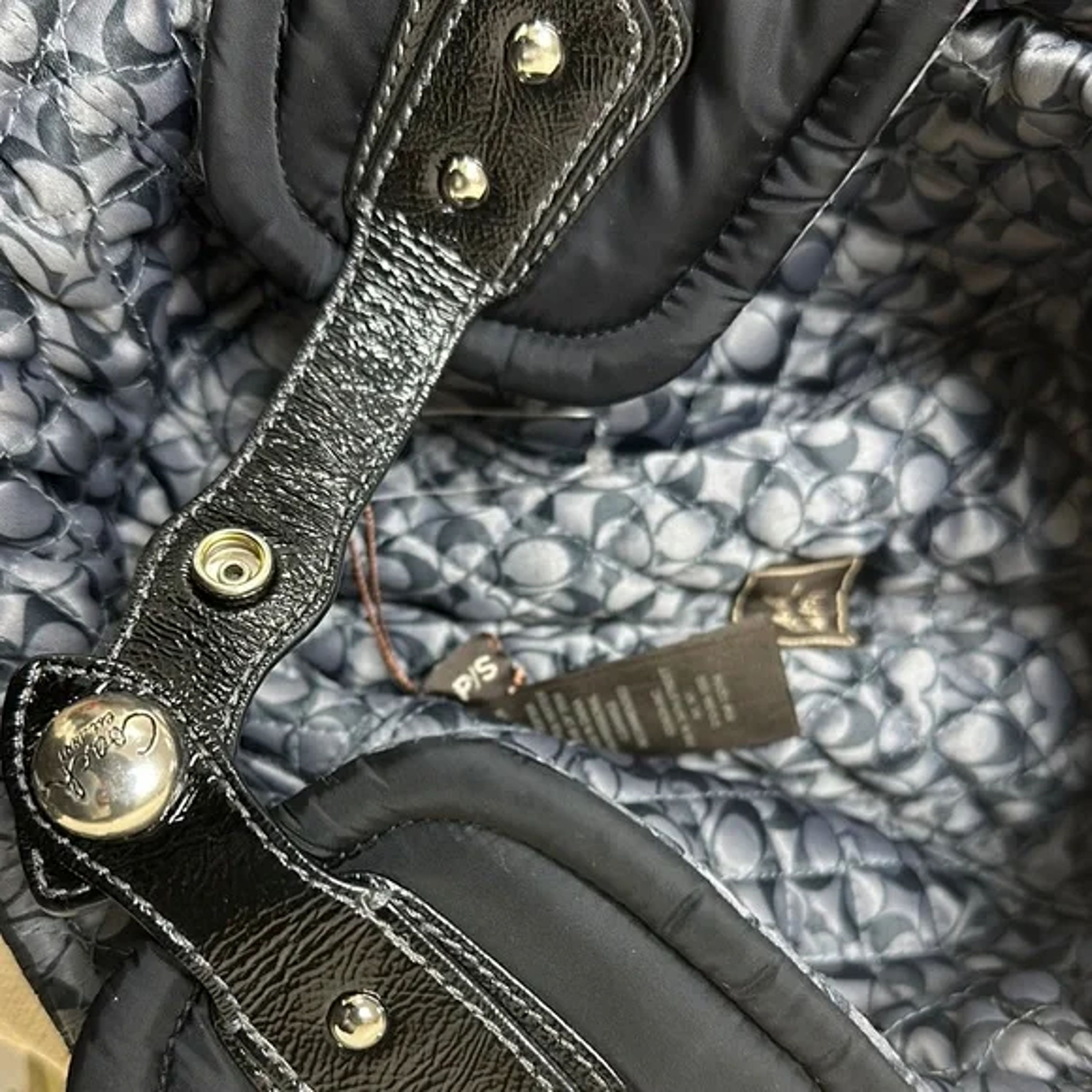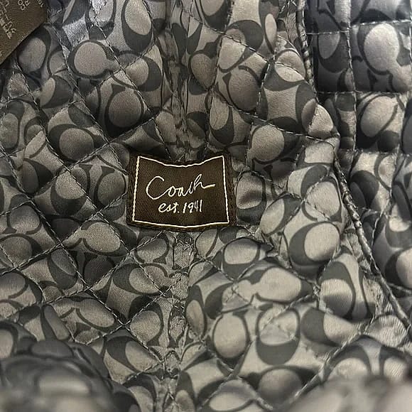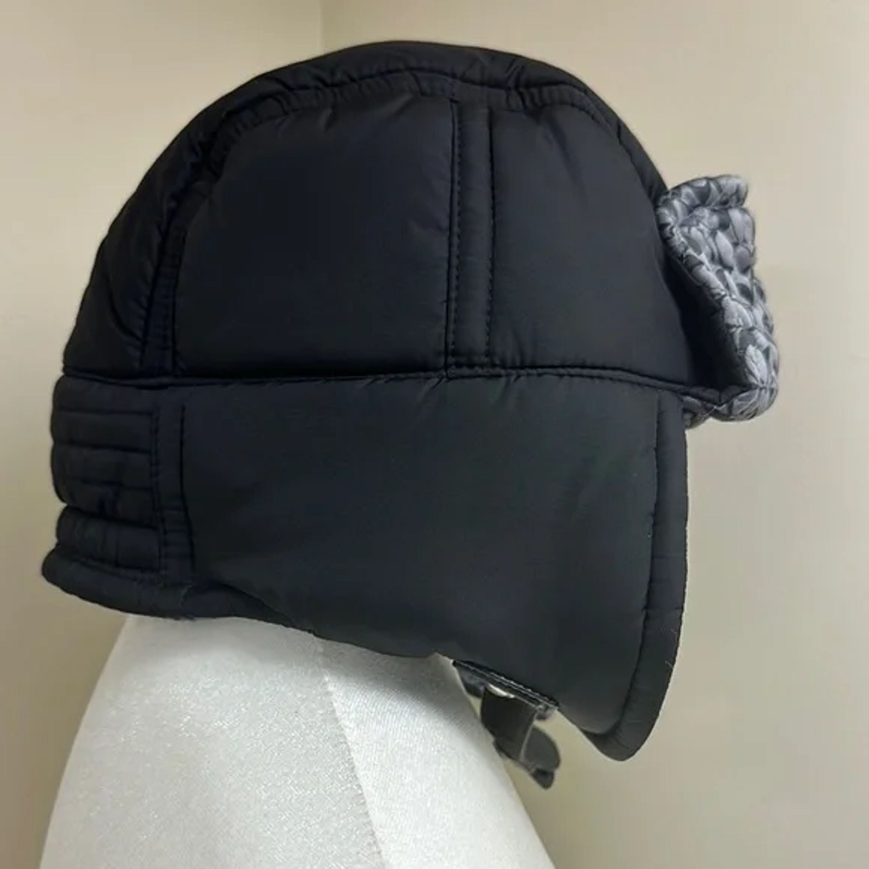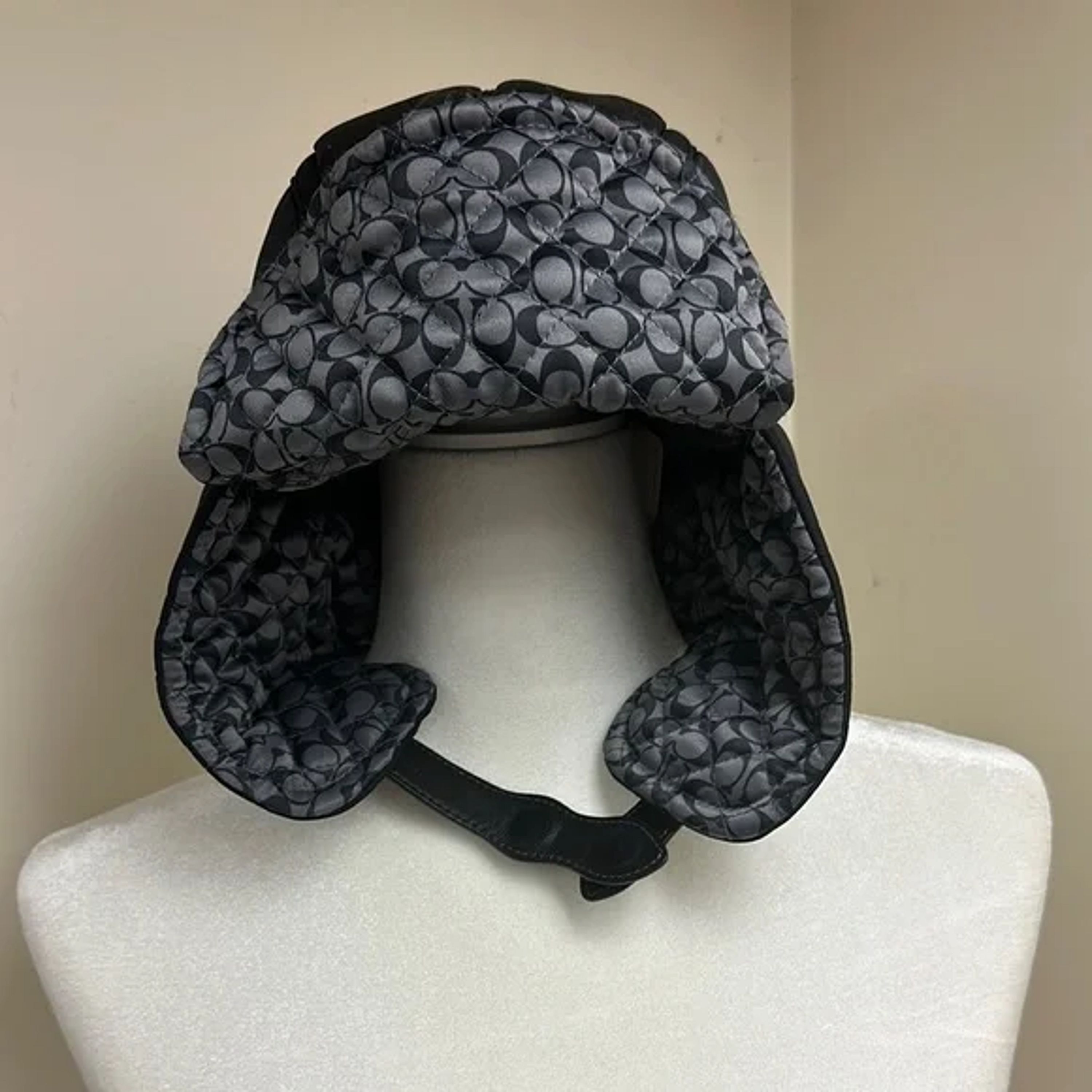 Stay warm and stylish with this Coach trapper hat, featuring a unique black and gray pattern. Designed with ear flaps and a chin strap, it offers both comfort and secure fit for cold weather. The quilted texture adds an extra layer of insulation, making it a perfect accessory for chilly days.