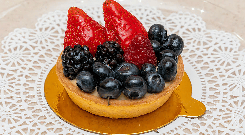 French fruit tart with a buttery shortbread crust, creamy vanilla custard, and heaps of fresh fruit.