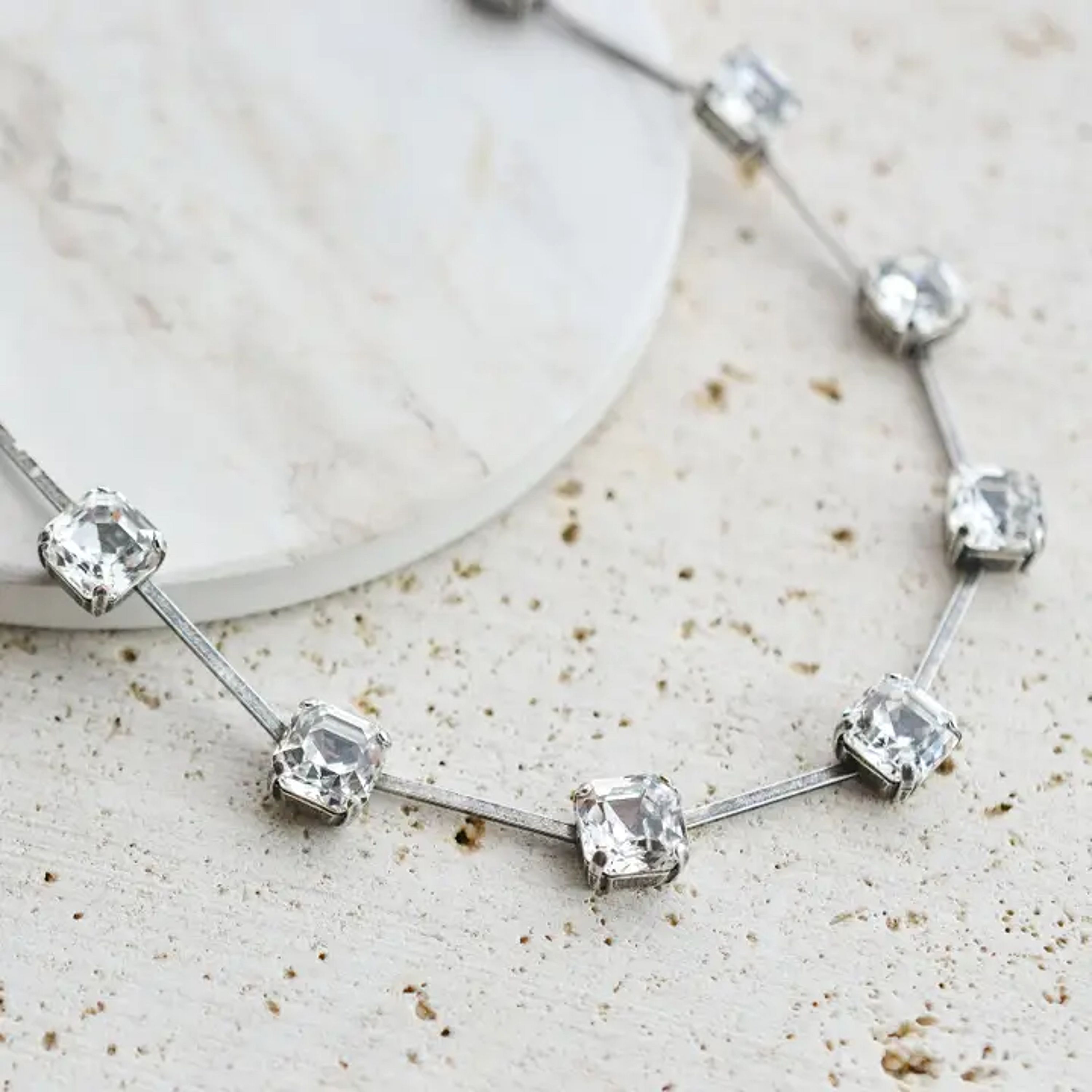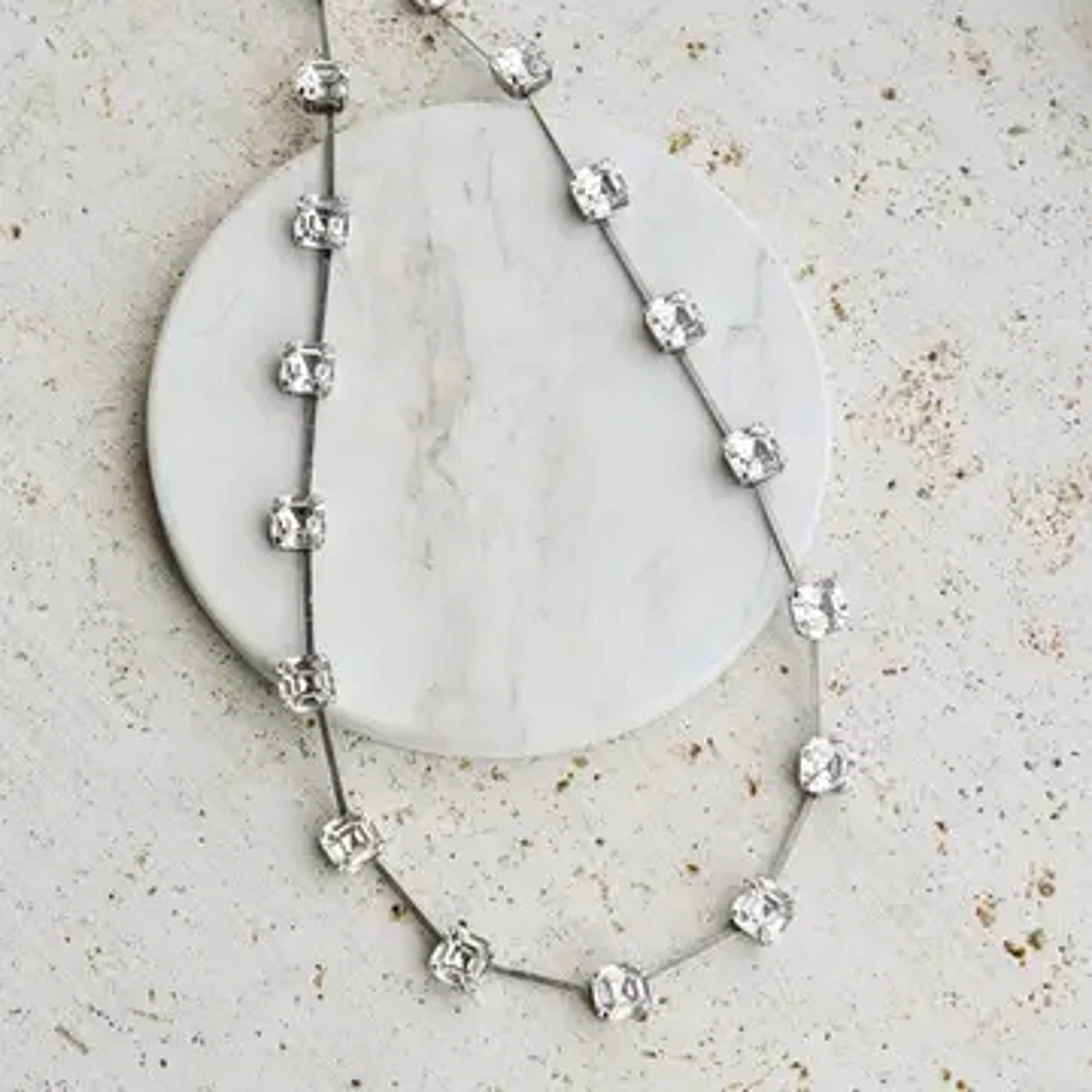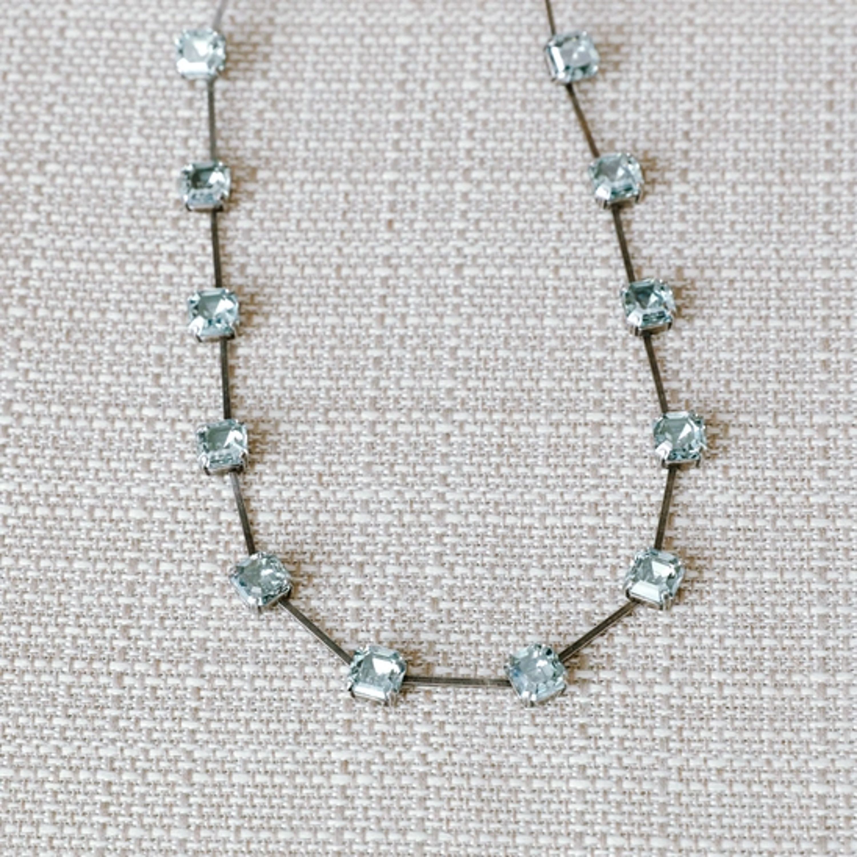 Imperial stone crystal necklace with extender. Each stone sits in almost an allusion-type setting with a bendable necklace base.