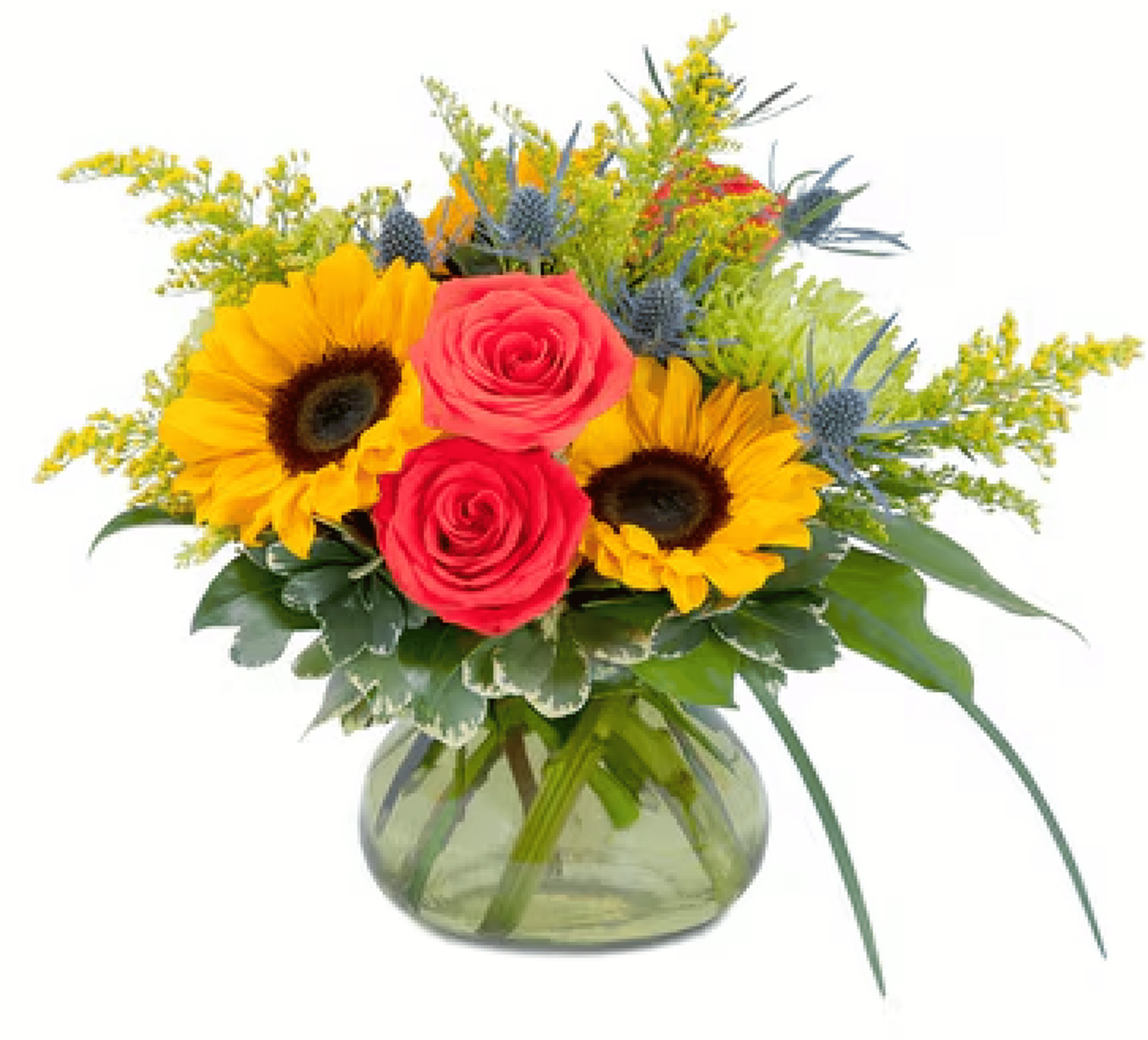 Bright but warm colors of sunflowers, roses and accent flowers combine in this design to bring a bit of sunlit beauty.
