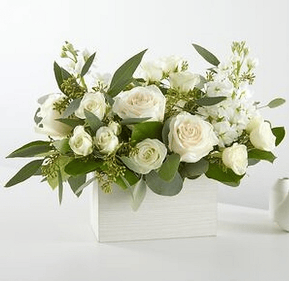 Create a serene and timeless atmosphere with our Fresh Linen Box Bouquet featuring roses, daisies, and eucalyptus.