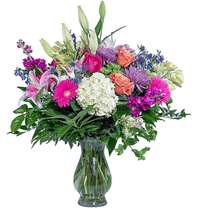 They rock your world. Love You to the Moon will express your devotion. A white hydrangea takes center "space" among stargazers, roses, and other flowers in our Bella vase. Approximately 27"W X 32"H #vday26