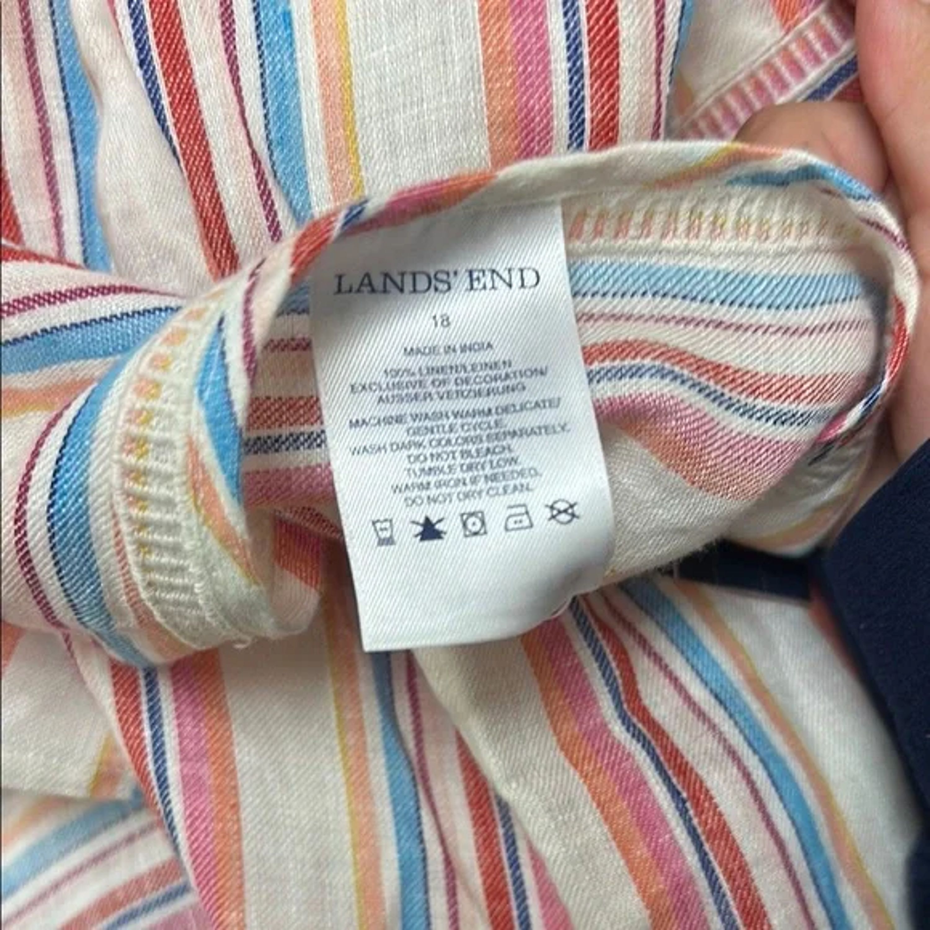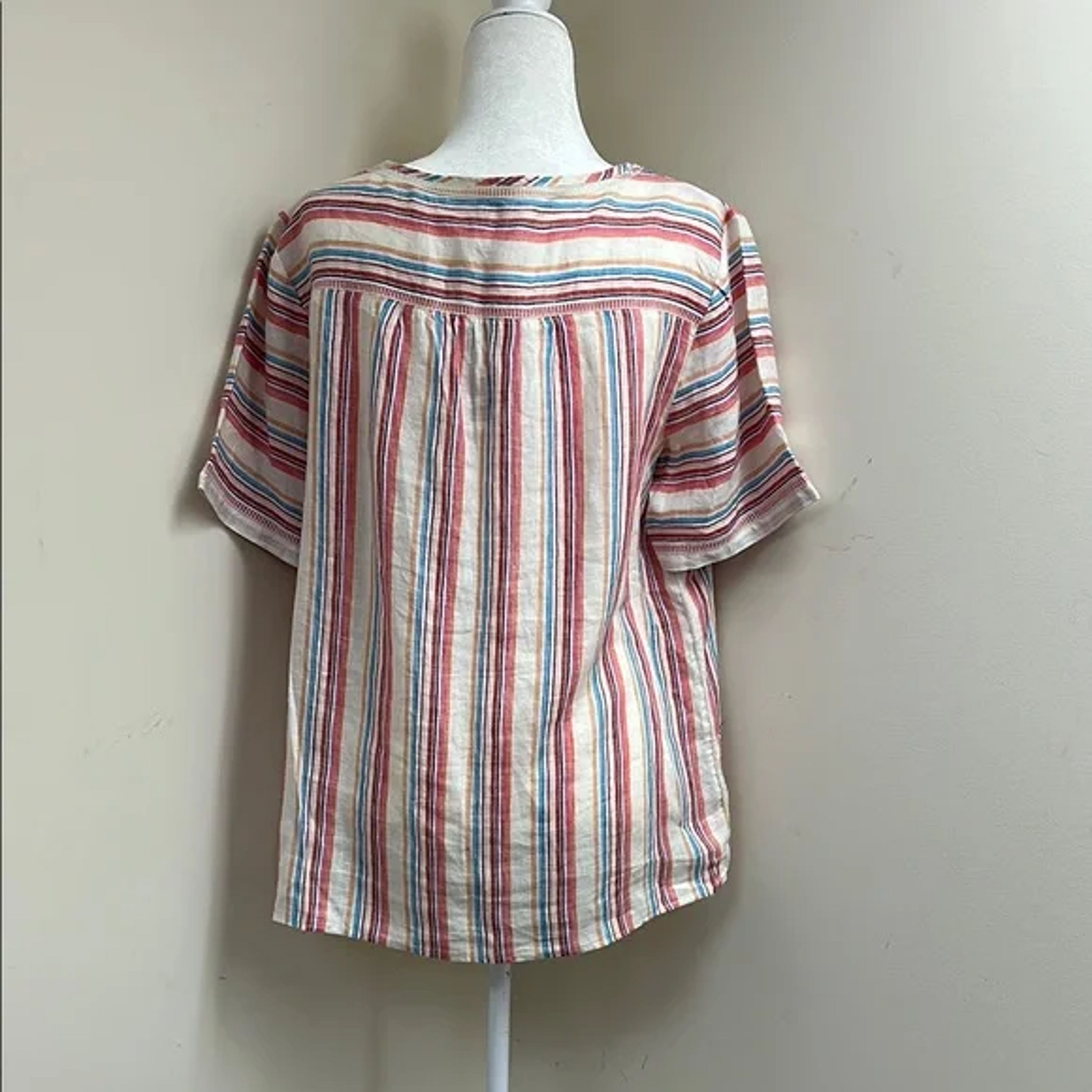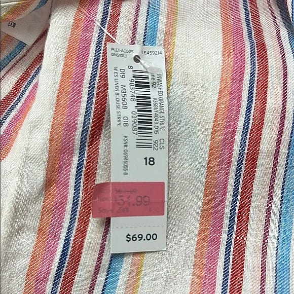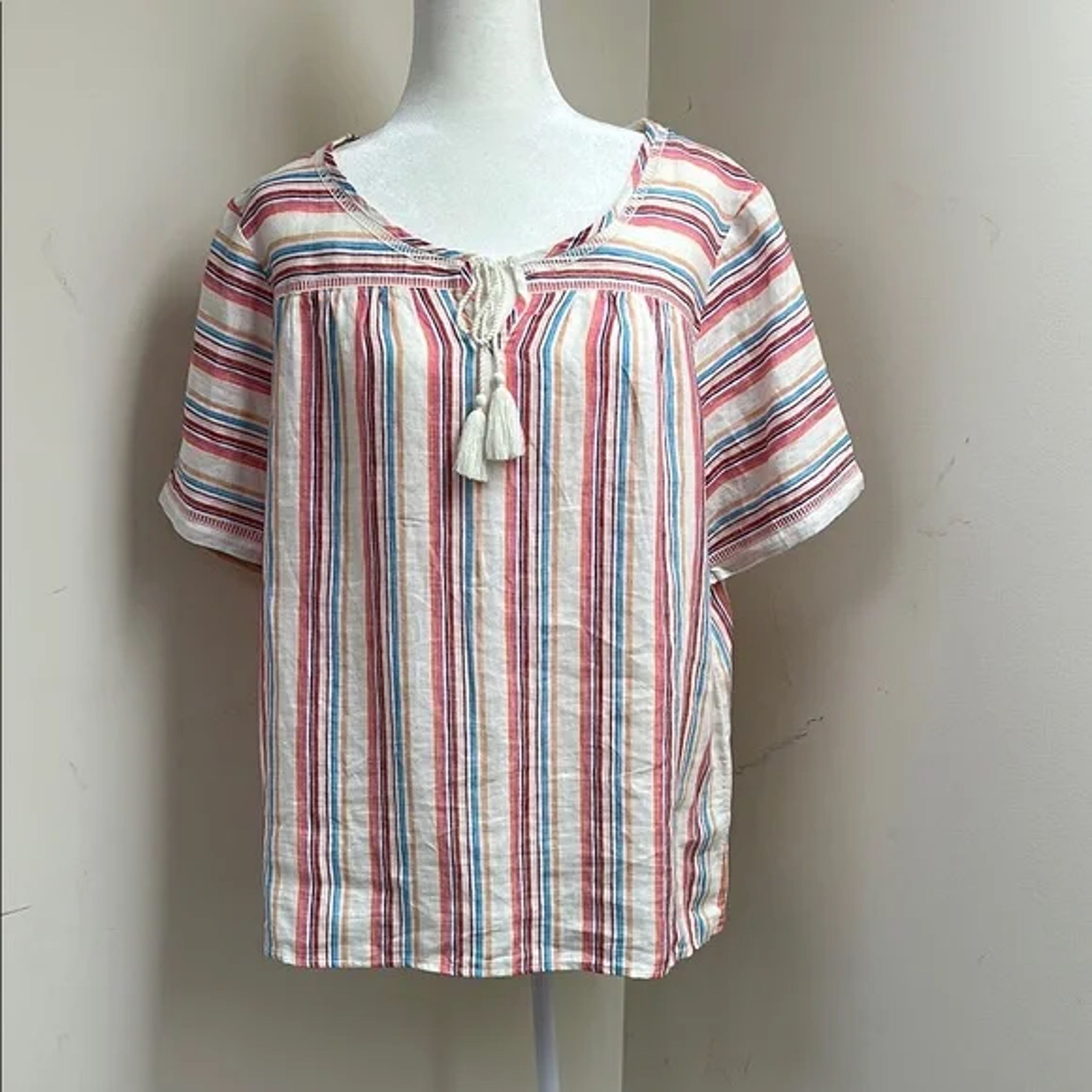 This relaxed blouse from Lands' End features a charming tie front and a boxy silhouette, perfect for a casual day out. The short sleeves and airy fabric ensure comfort, while the pink and blue hues add a touch of elegance to your wardrobe.