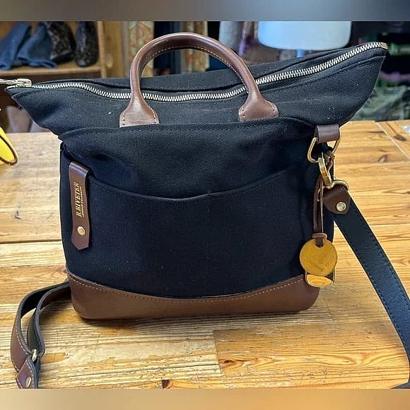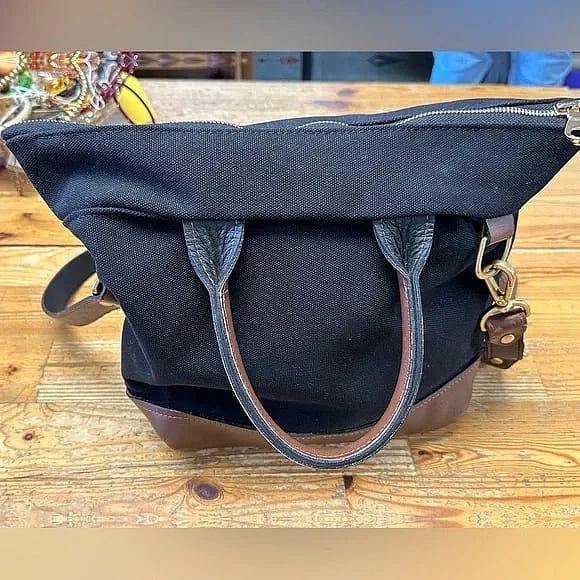Purse, handbag, crossbody Cotton canvas, Genuine brown leather, Brass Feet Adjustable leather crossbody strap, from 35-44 inches Base width 10” x Base depth 4” x Height 11.25” x Opening width 13” x Handle Drop 5” Size: One Size