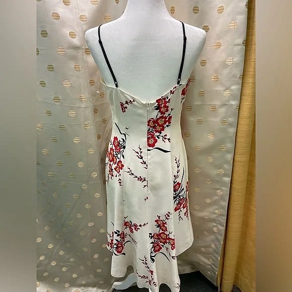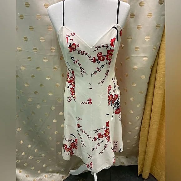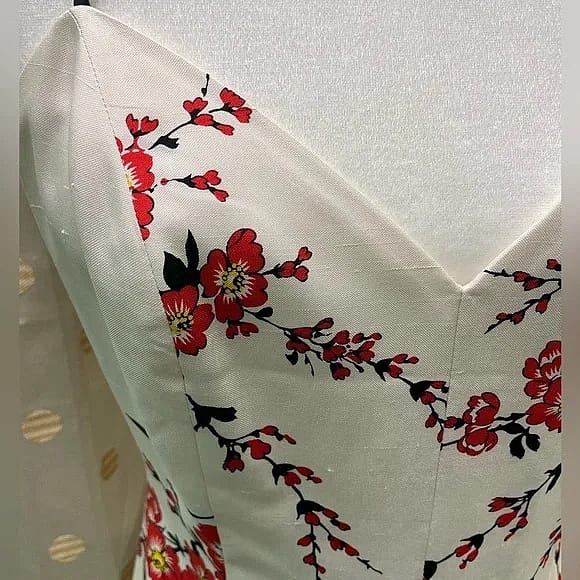 Cherry Blossom Slip Dress in 100% Silk Dupioni This features a sweetheart neckline and spaghetti straps, a slight bustier bodice cut, fully lined, and a back zipper.