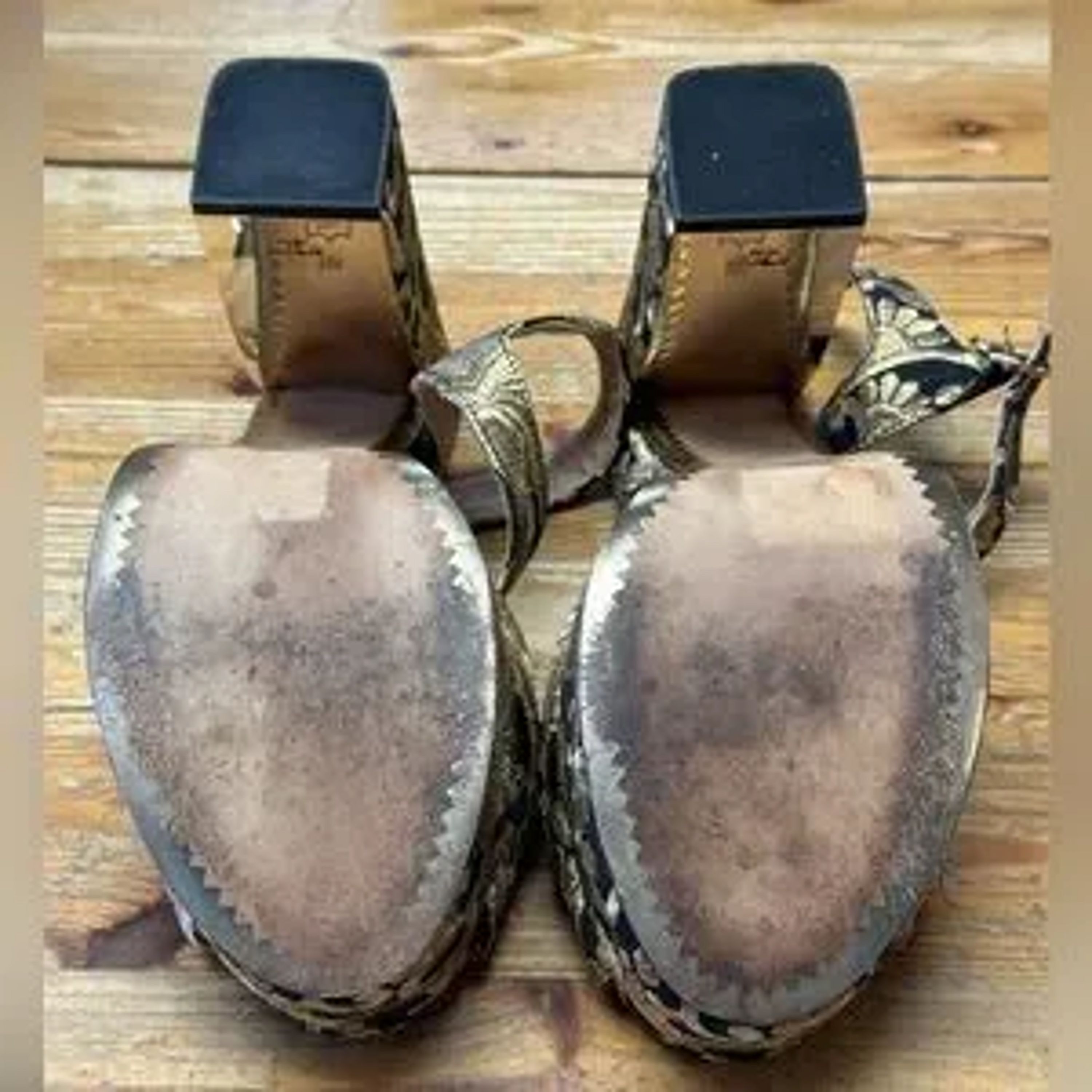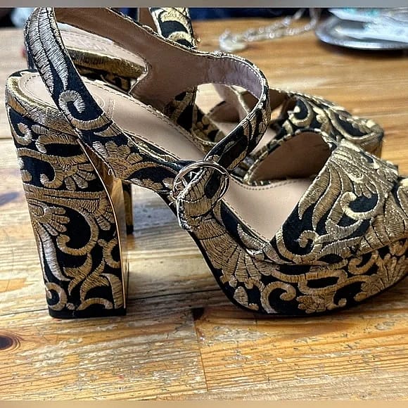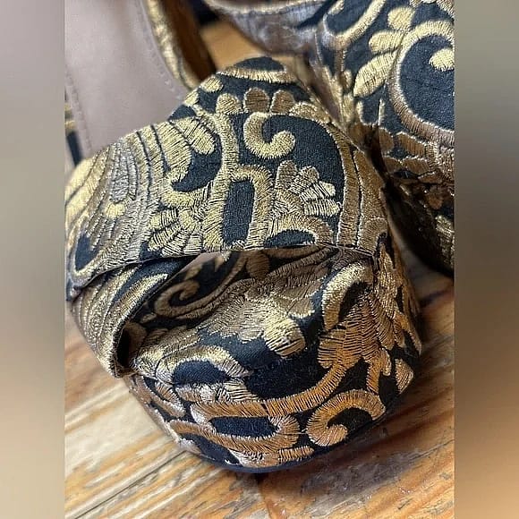 Tory Burch Black And Gold Embroidered Brocade Platform Sandals. 5 Inch Heel. Size: 9