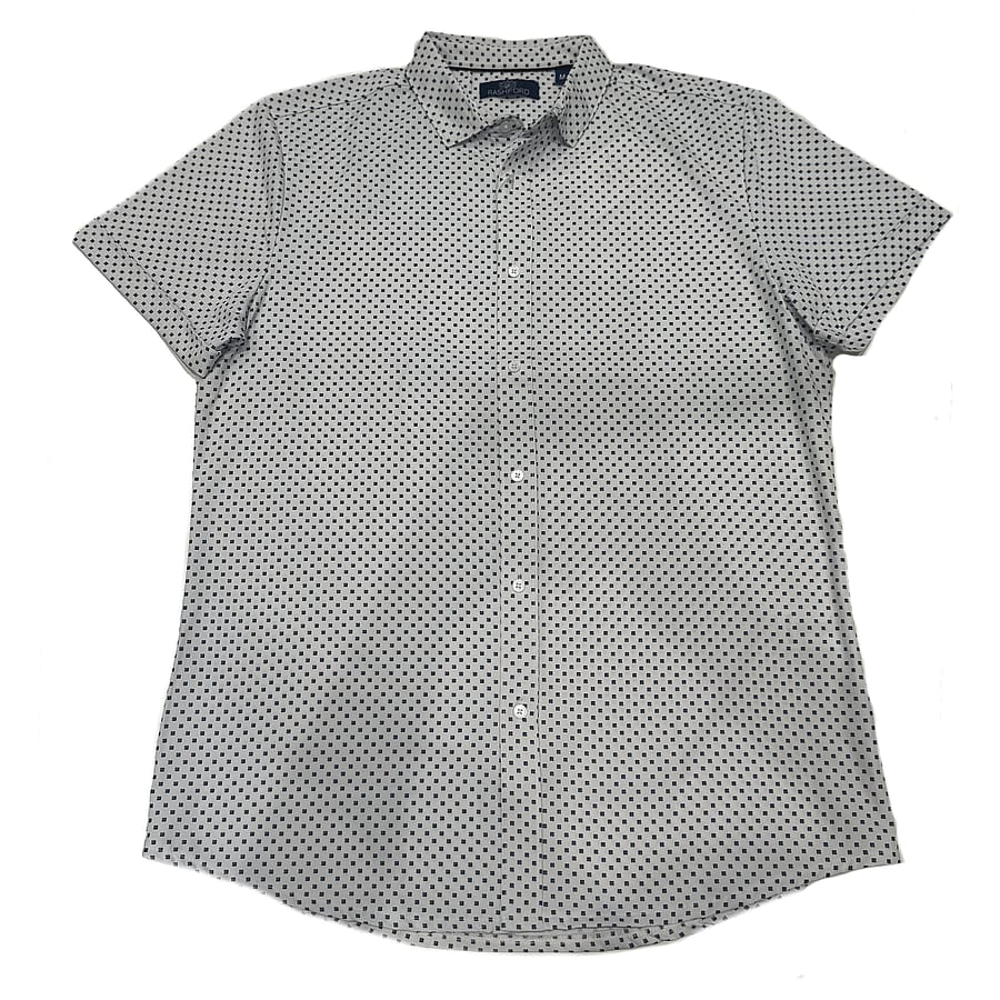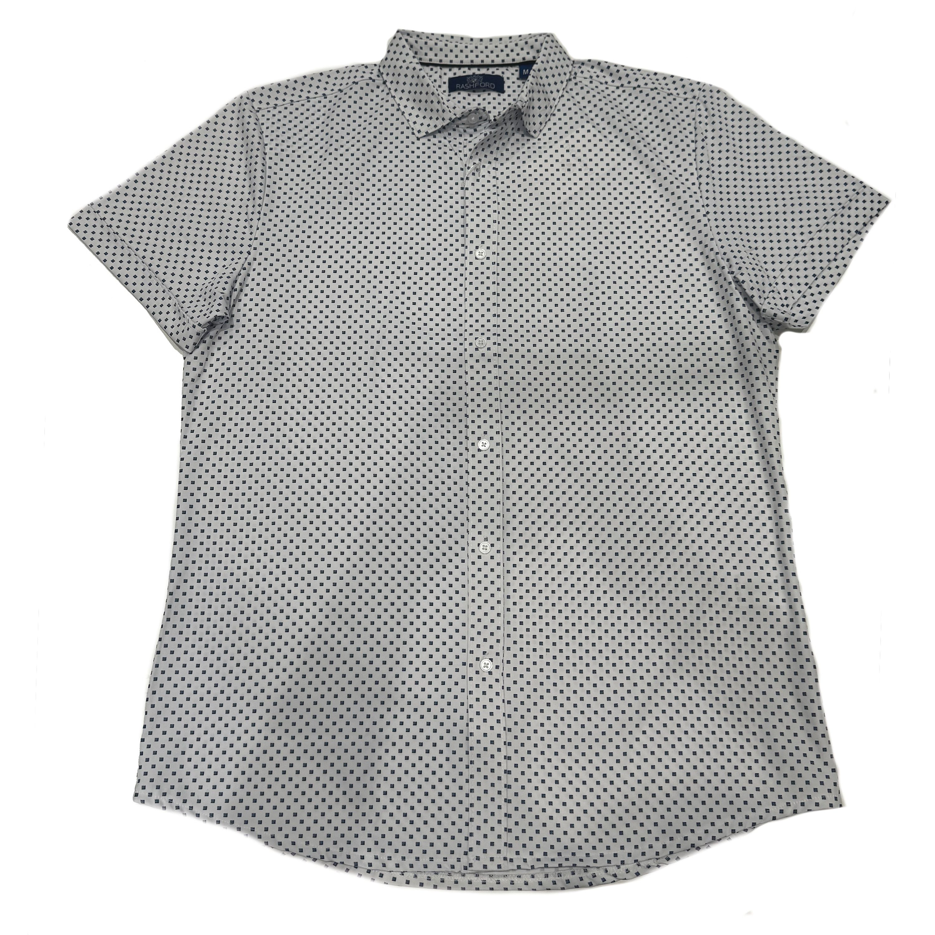 Short sleeve button down stretch sport shirt with mini square pattern.
