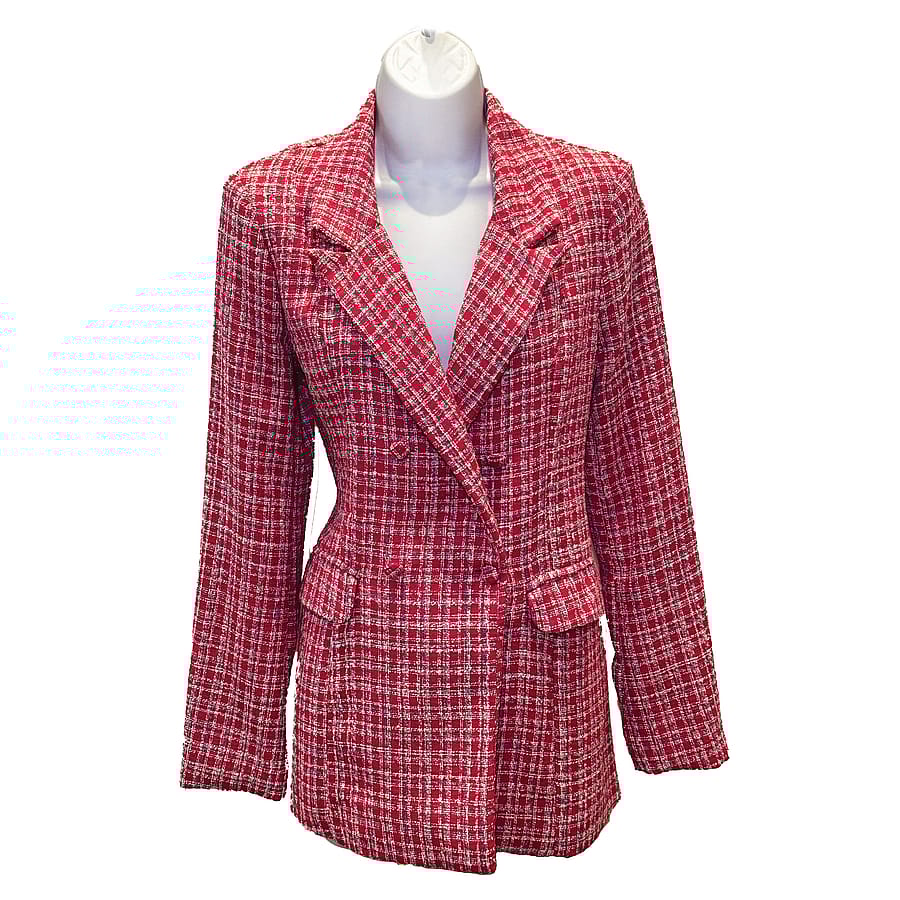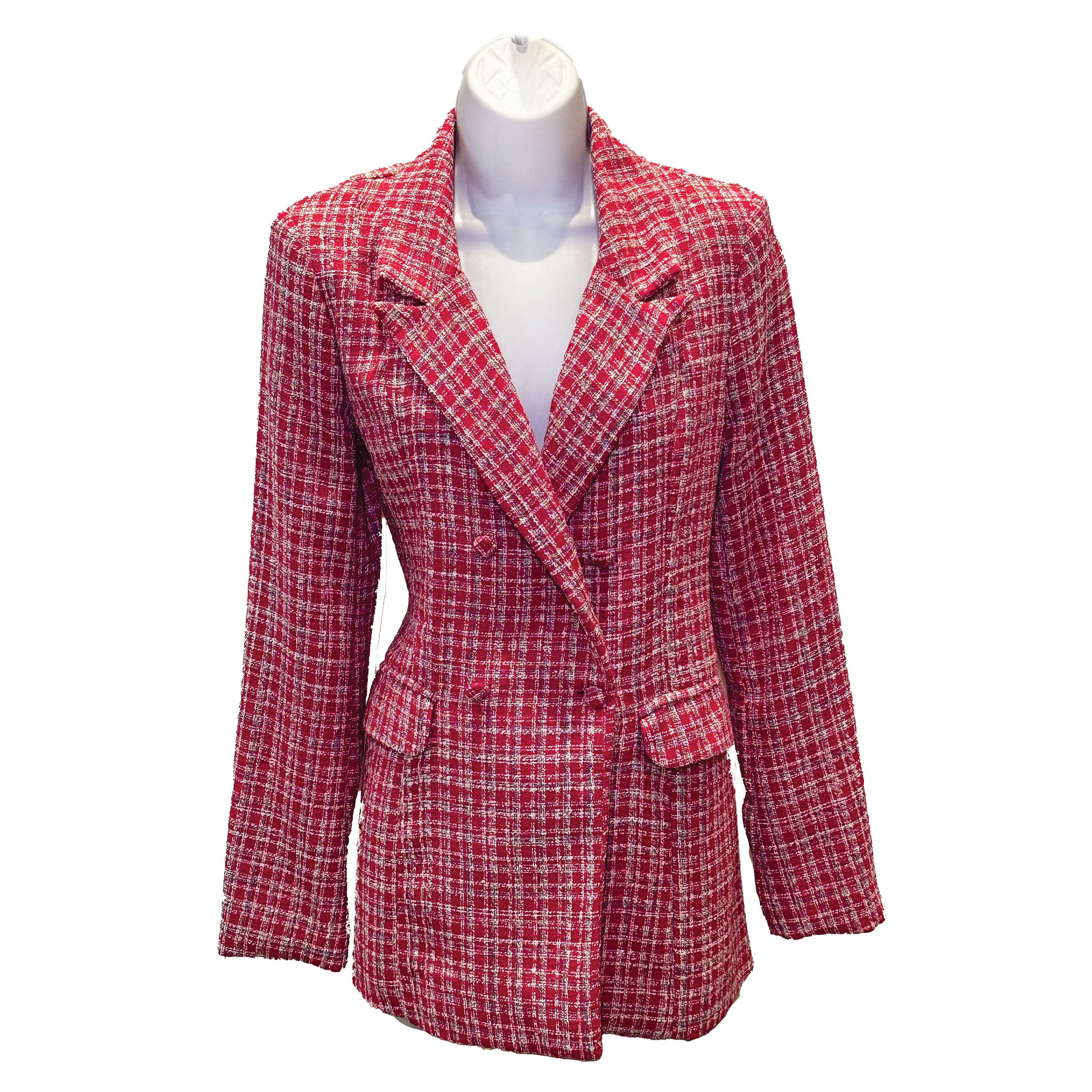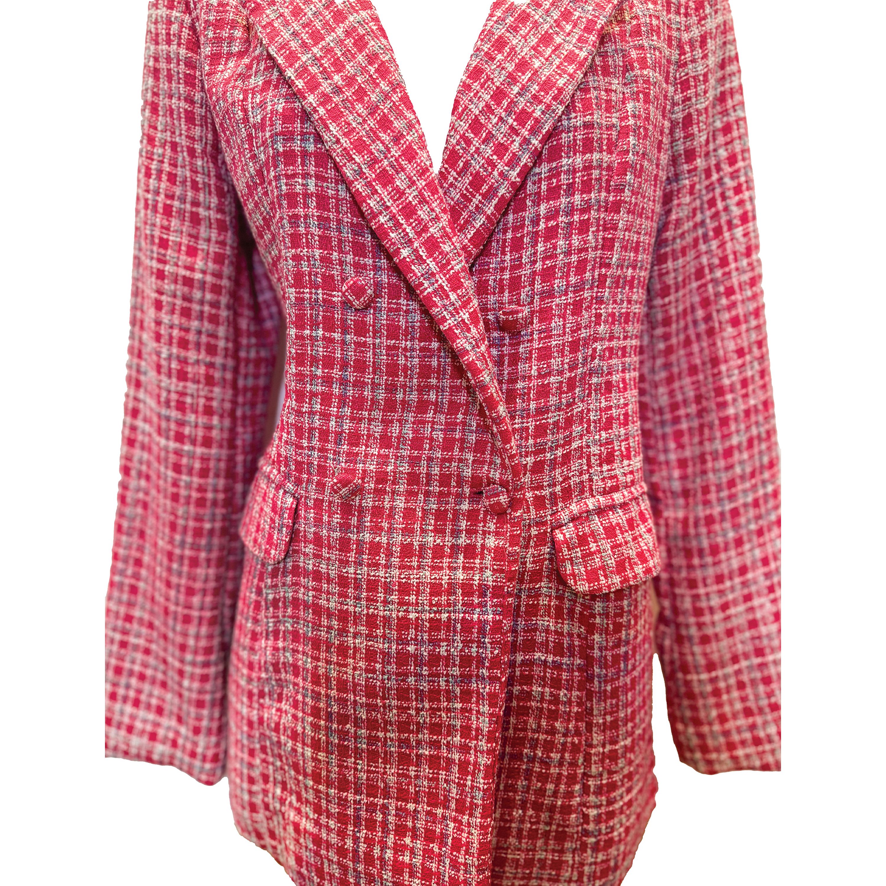 Double-breasted Cotton Boucle Plaid Flamingo Pink Jacket.