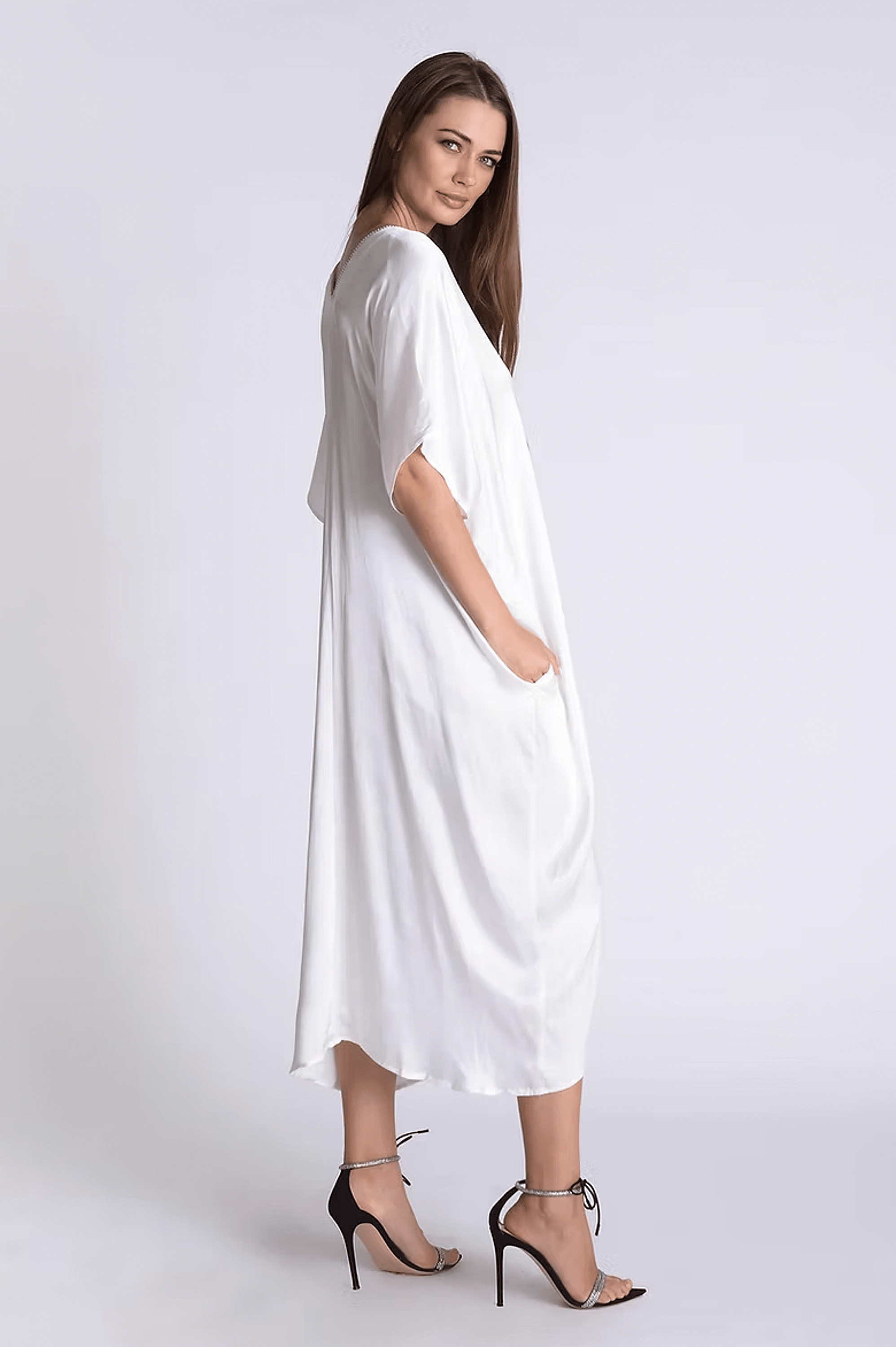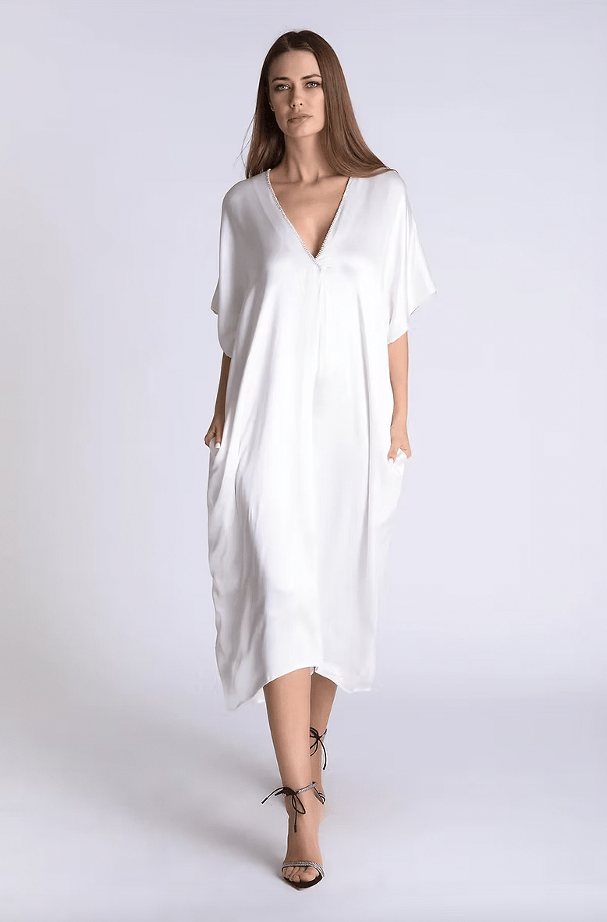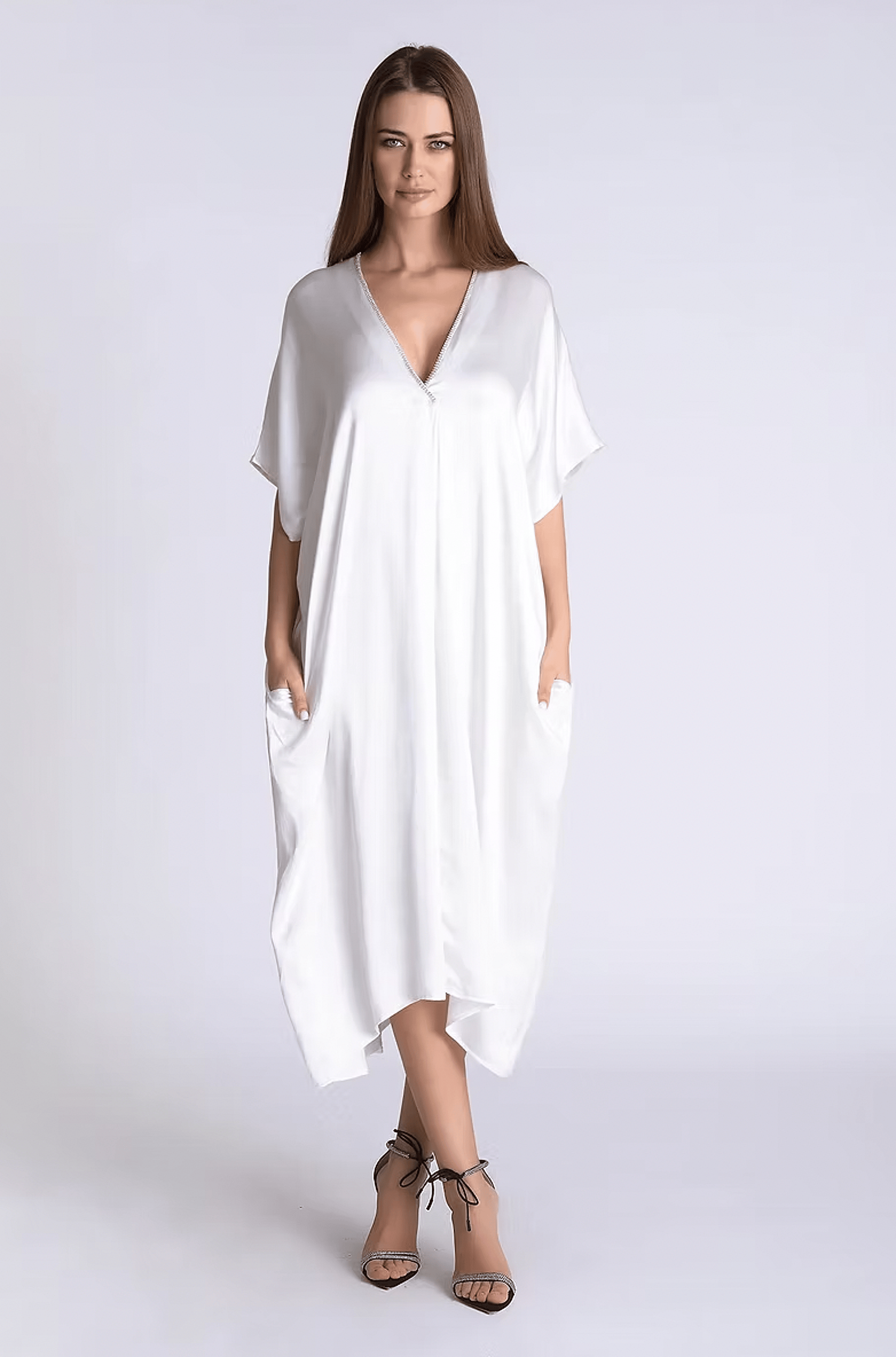 One-size satin maxi with rhinestone neckline. Color: White -100% polyester Imported