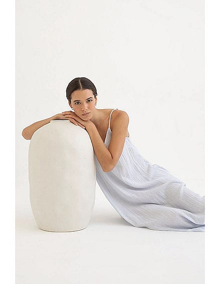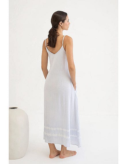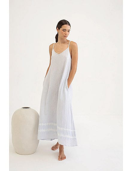 Aubarca is a tie-dye dress with adjustable straps. It features a flounced hem and side seam pockets, combining style and functionality for a summery and comfortable look. Ice Blue 100% cotton