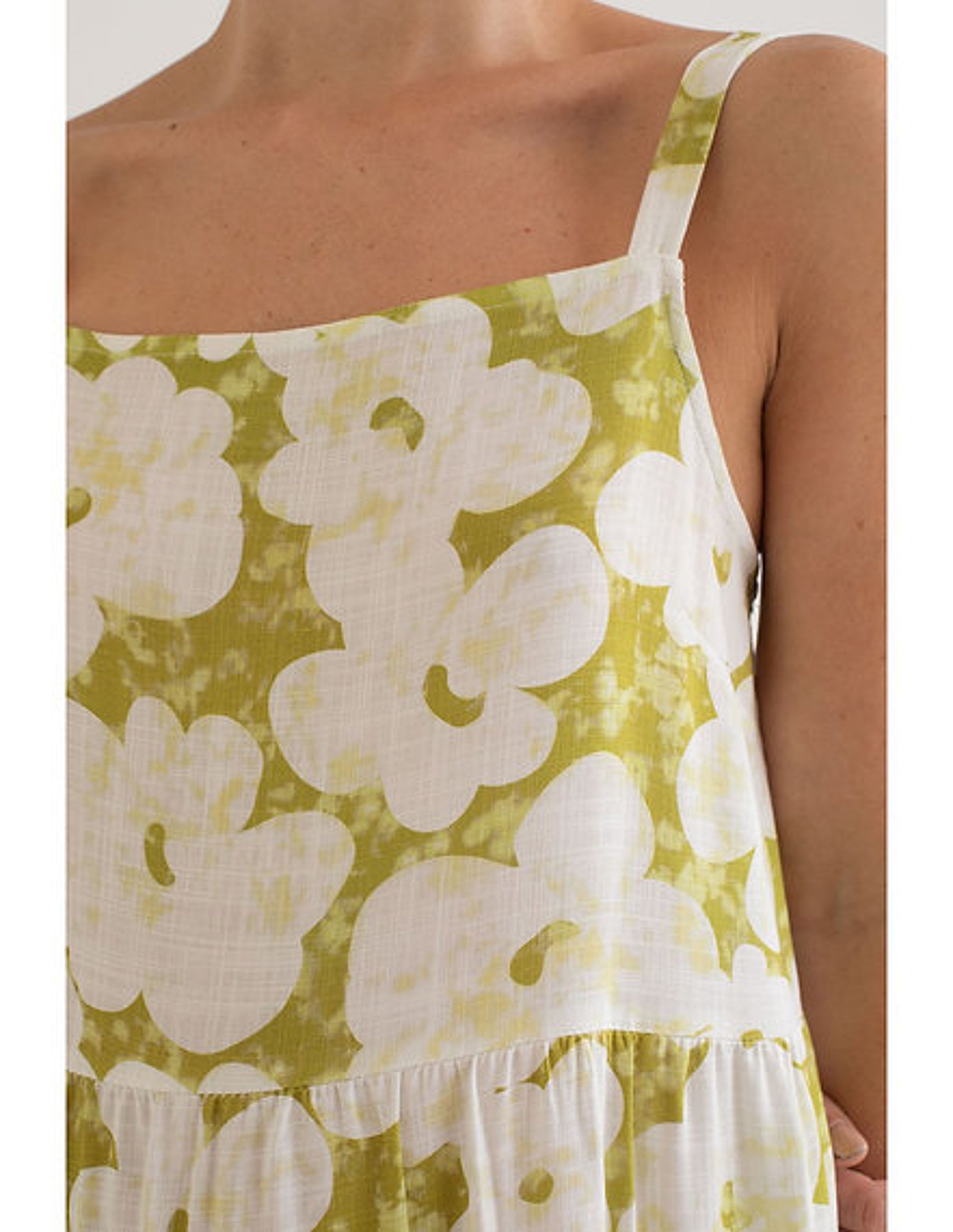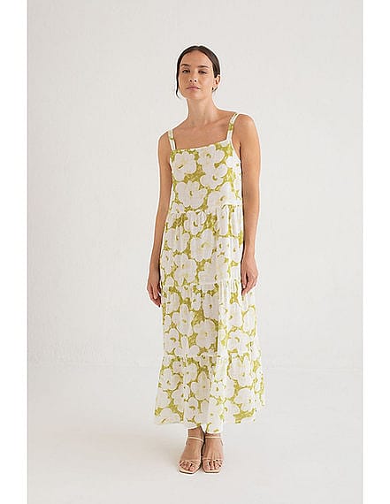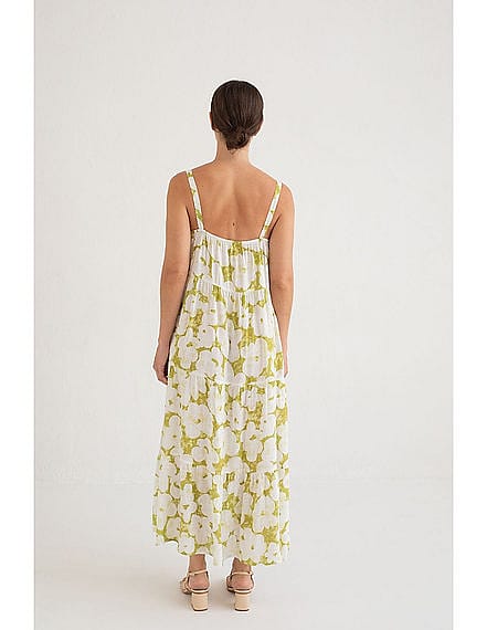 The Hiva dress is a green floral print dress with thin straps. With three gathered sections that give the dress a flowing effect, adding movement and freshness to the design, made for the spring-summer season. 100% rayon