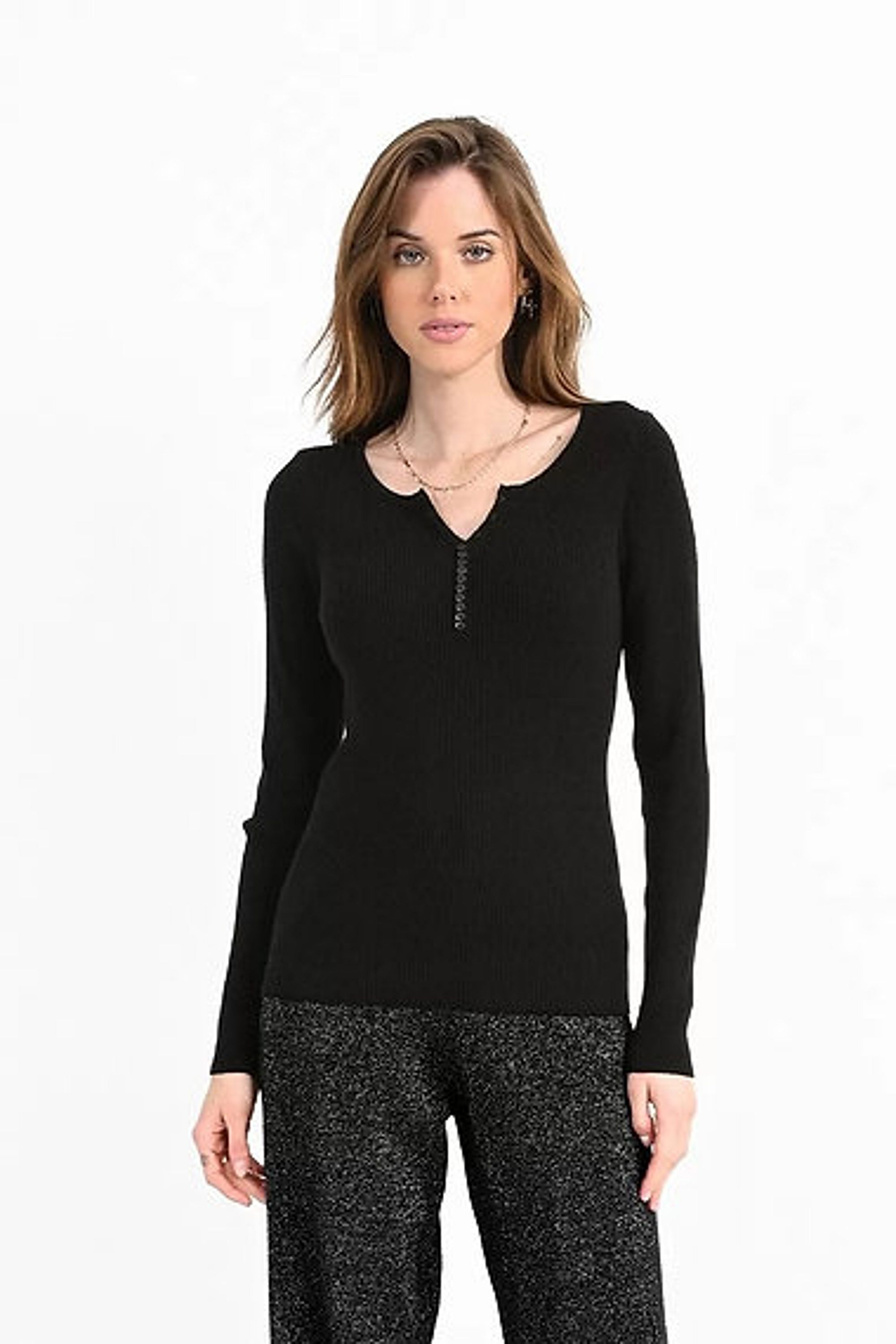 Body con knit henley style ribbed sweater with non-working buttons. Black 51% viscose 30% polyester Available in Size Medium 19% polyamide Imported