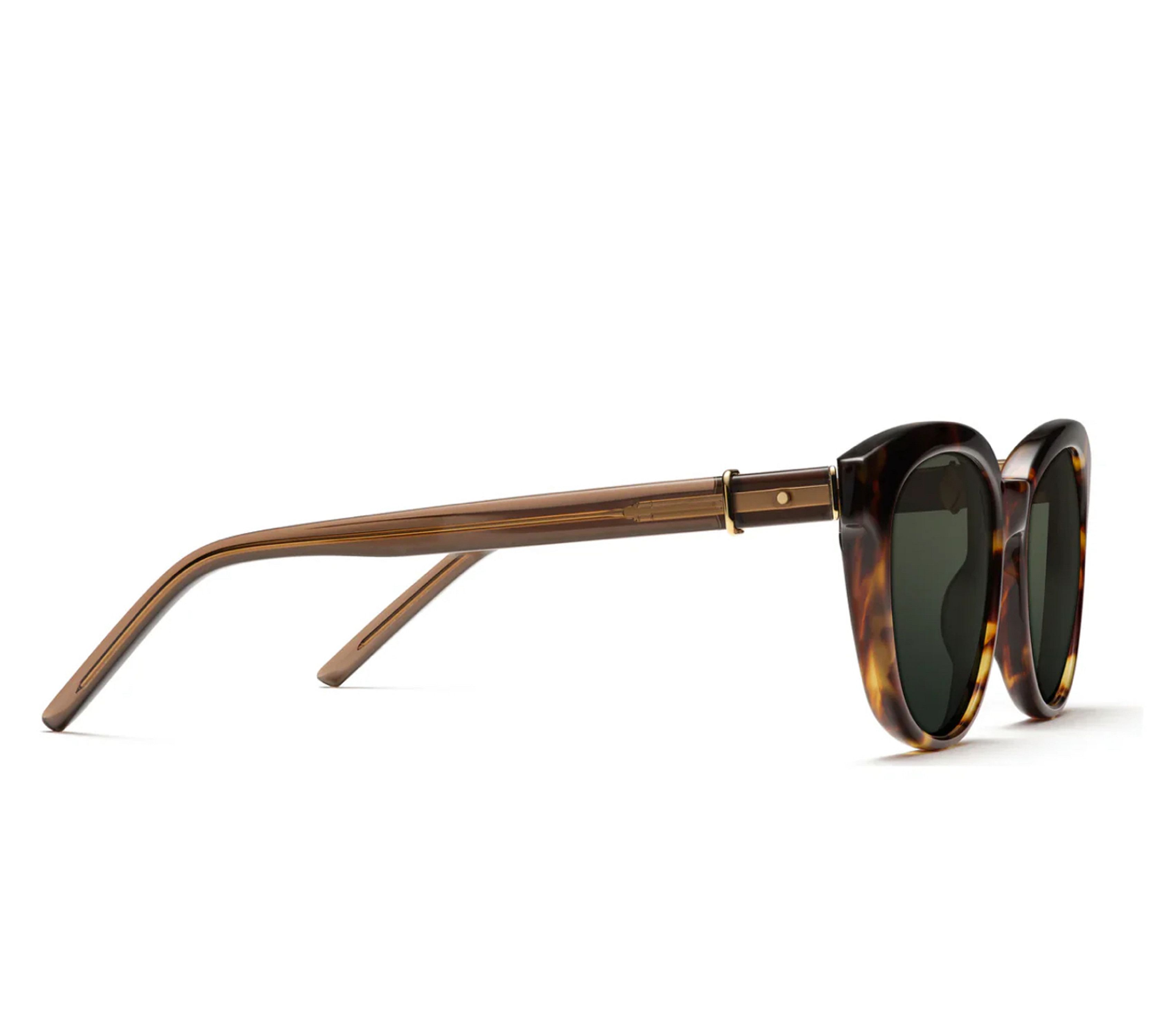 Infusing modern energy with iconic style, this elegant cat-eye sun frame is handcrafted in Japan from the finest acetate and finished flawlessly with the signature hinge. Size: 54/18 Temple: 145mm Material: Acetate Color: Sepia 473