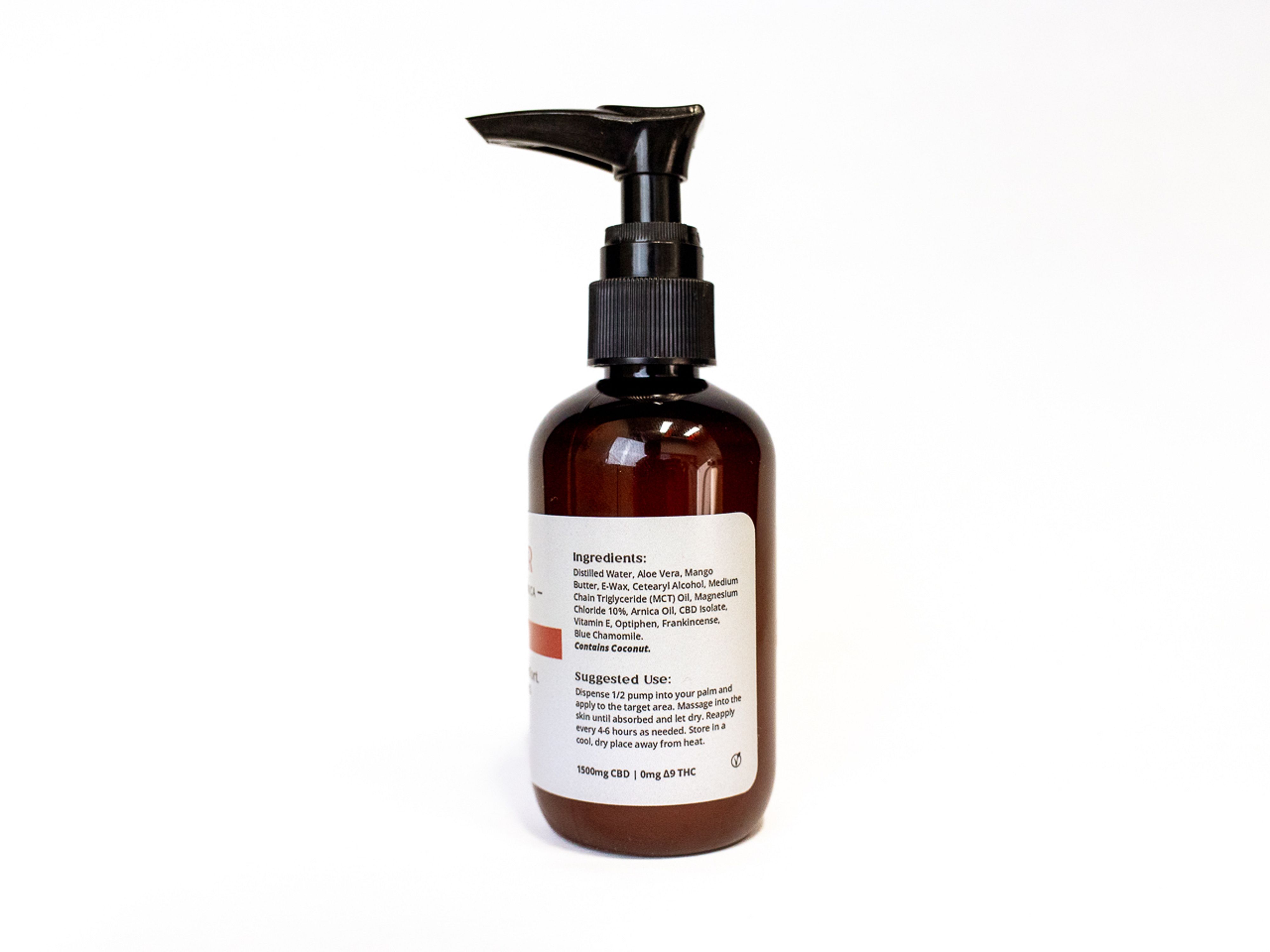 Ingredients: Distilled Water, Aloe Vera, Mango Butter, E-Wax, Cetearyl Alcohol, Medium Chain Triglyceride (MCT) Oil, Magnesium Chloride 10%, Arnica Oil, CBD Isolate, Vitamin E, Optiphen, Frankincense, Blue Chamomile.