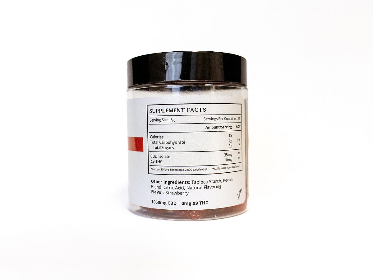 Ingredients: Sugar, Tapioca Starch, Pectin Blend, Citric Acid, CBD Isolate, Natural Flavoring | Flavor: Strawberry
