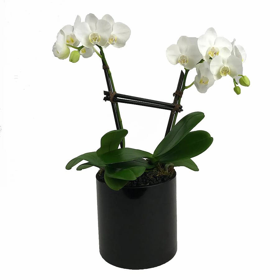 Premium miniature double spike orchid planted in a ceramic or glass container and topped with river rocks. Substitutions may be necessary due to availability. Product ID: 101024