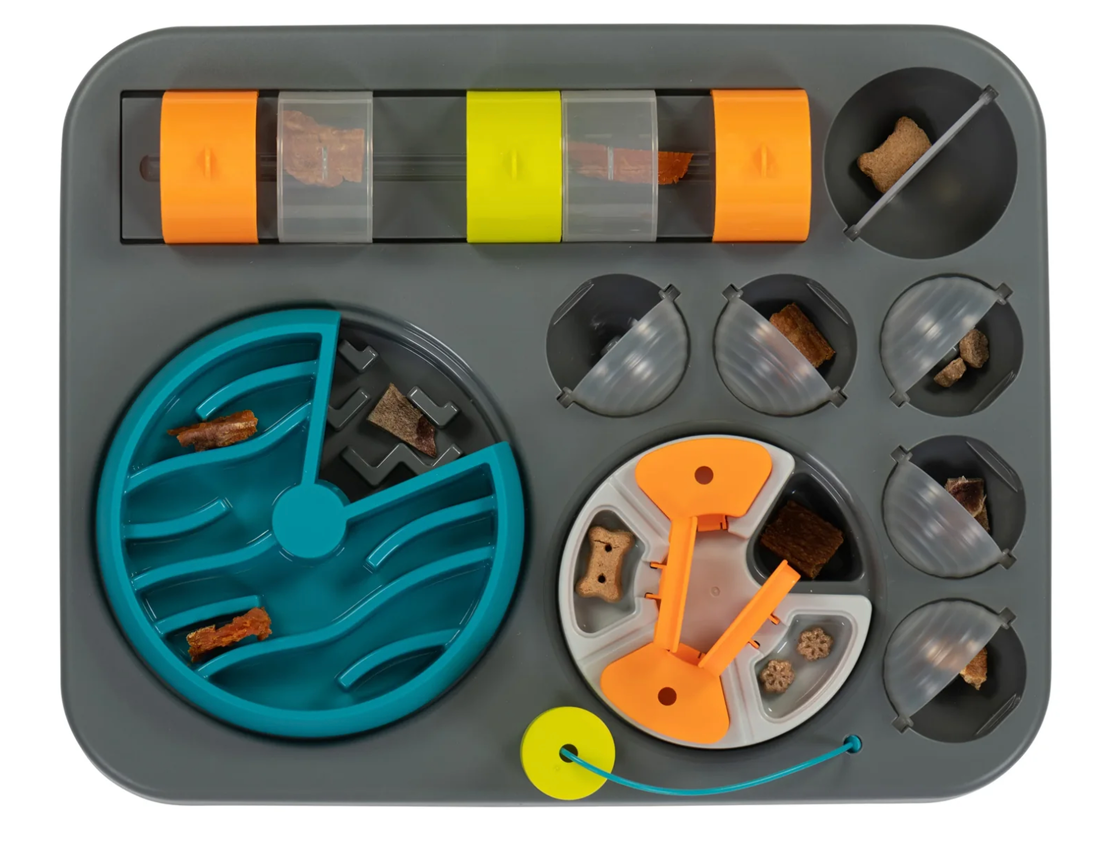 The multiple compartments, surfaces and sliding parts make finding food an adventure, engaging their minds and stimulating their natural desire to sniff, paw and forage.