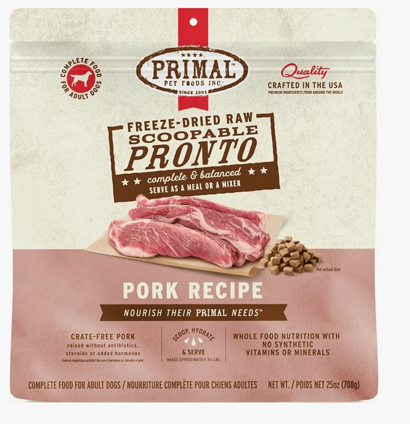 Feed your pup’s need for meat with Raw Pronto Pork Recipe Dog Freeze-Dried Food from Primal! Made in the USA with high-quality proteins, this freeze-dried dog food provides a 100% complete and balanced raw food diet for adult pups. It’s crafted with crate-free pork raised on USDA-certified organic fruits and vegetables without the use of steroids or added hormones. Conveniently packaged and dinner-ready in seconds—this dog feed’s highly-digestible formula maximizes nutrient absorption to help support healthy weight, skin, eyes, oral health and more.