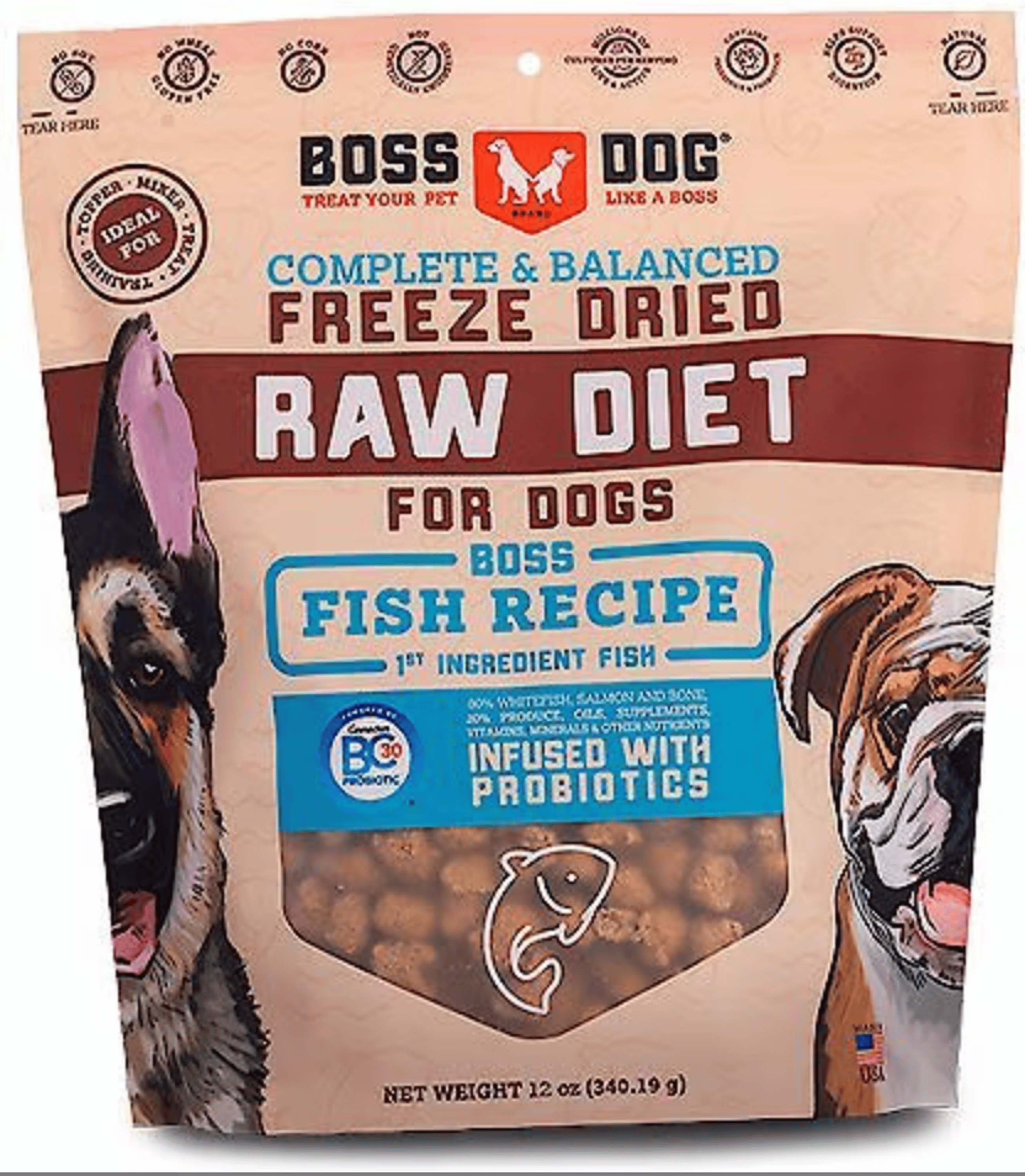 With fish as the first ingredient, Boss Dog Fish Flavor Freeze Dried Dog Food delivers the nutrition your best friend needs without any of the bad stuff. With fish oils, vegetables, minerals and infused probiotics, this food is not only tasty, but it also provides paw-some digestive support, too! It’s a complete and balanced meal, but you can also use it as a treat, topper or mixer to encourage your best friend to clean up his meals. Because this food is free of gluten, corn, soy and GMO ingredients, it’s paw-fect for furbabies who have allergies or food sensitivities.