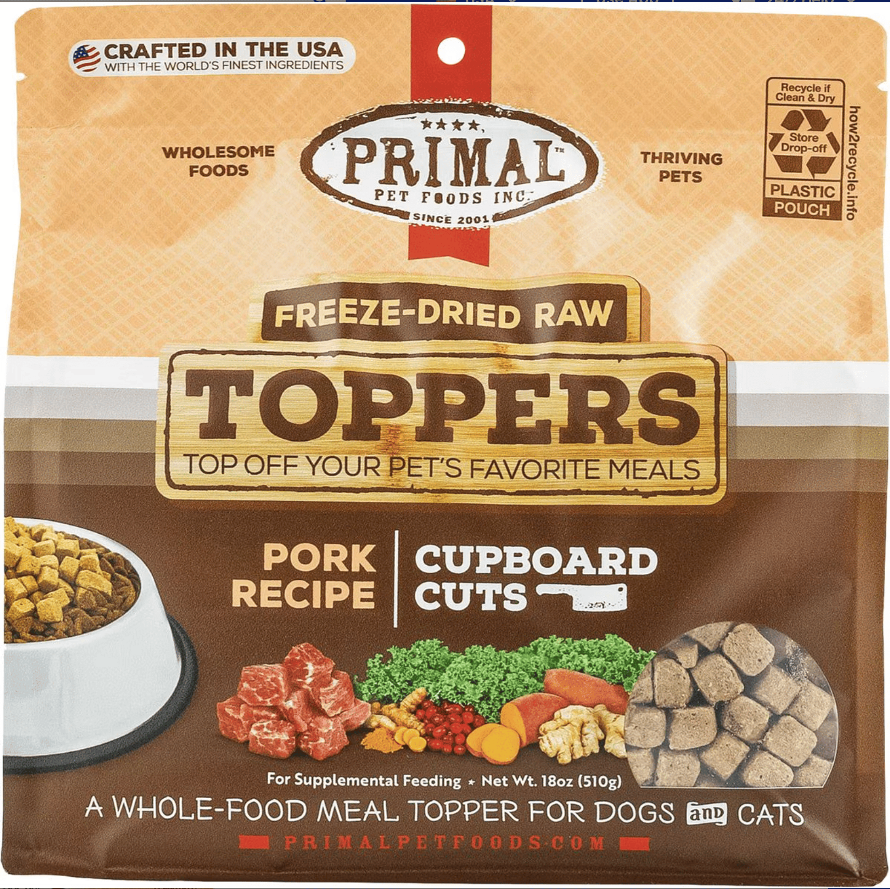 Your furry friend is going to love this Primal Cupboard Cuts Pork Grain-Free Dog Food Topper! This meat and organic produce topper adds a boost of nutrition to any diet. Intended for supplemental feeding, this recipe contains probiotics for safety and features delicious, freeze-dried bits. Simply add this topper to your canine companion’s favorite food!