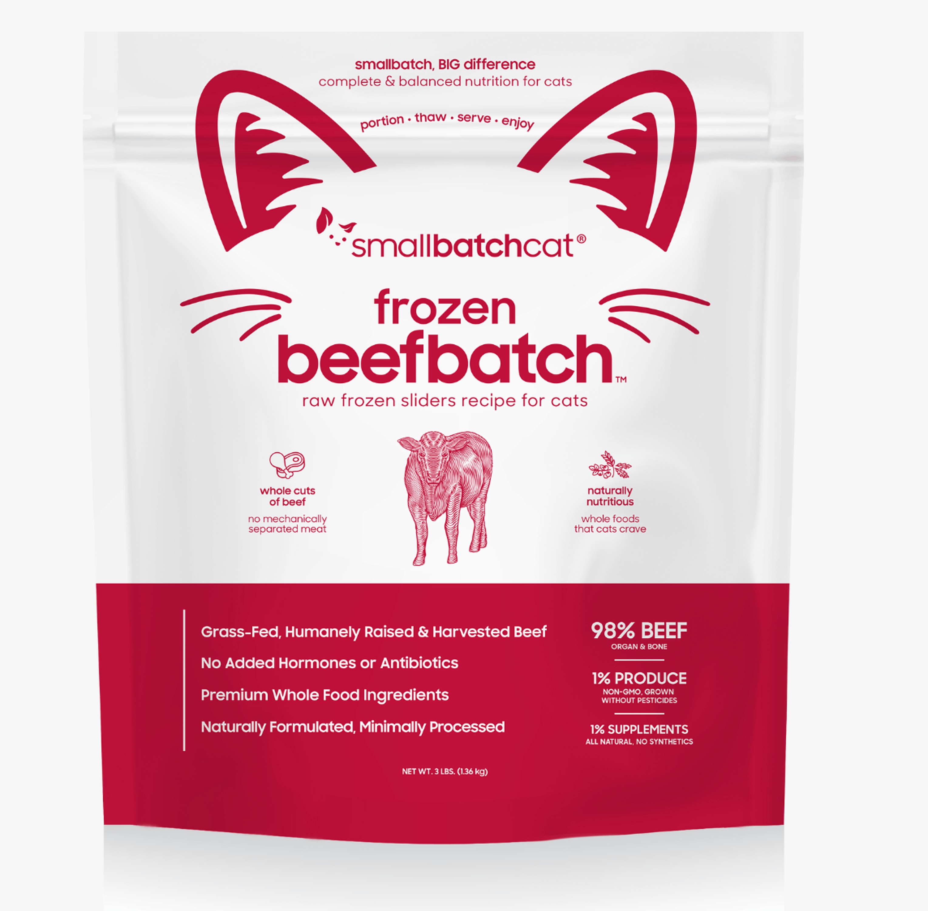 98% humanely raised grass fed beef, 1% organic produce, 1% natural supplements