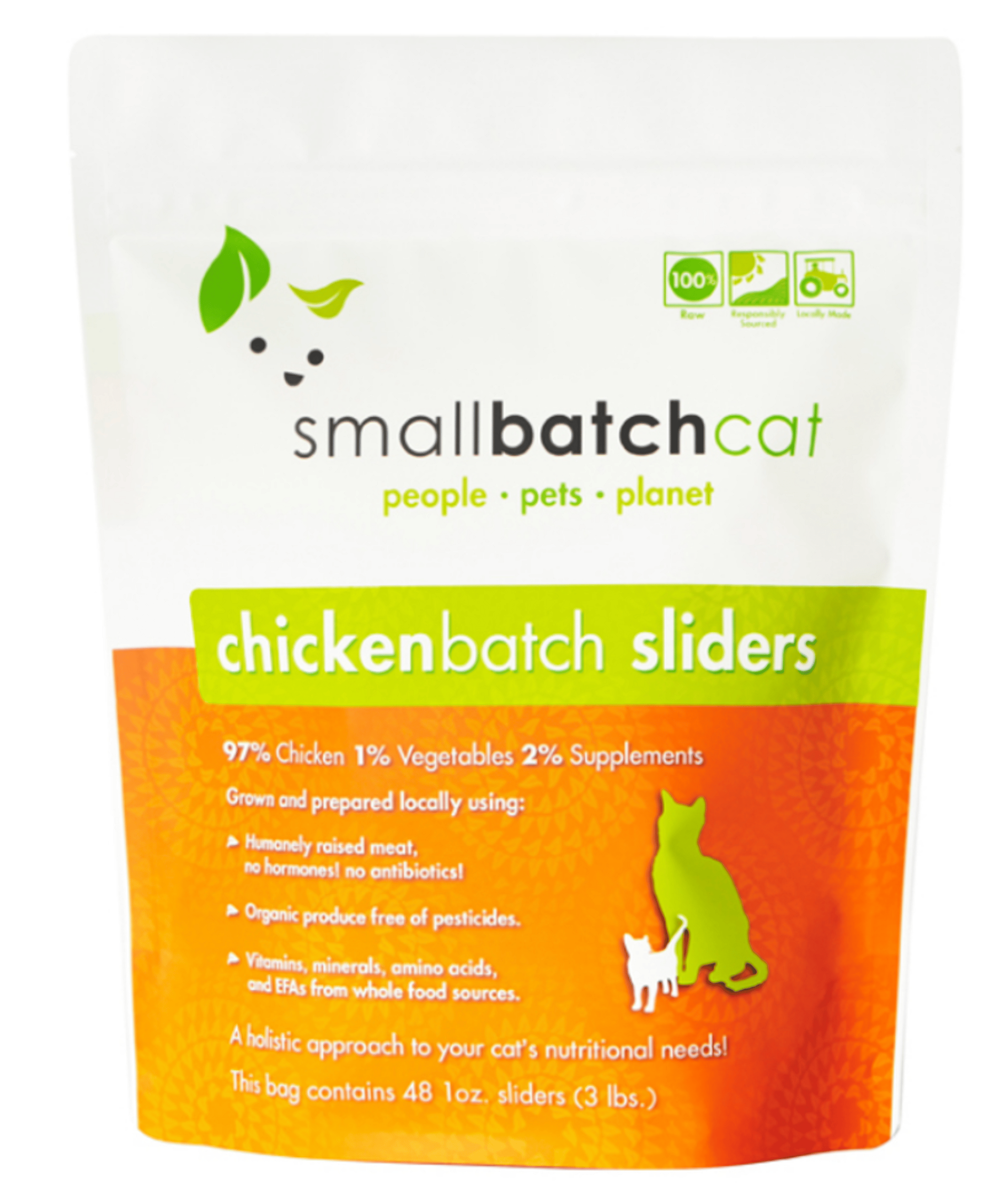 Feed your cat the pure raw way mother nature intended with convenient Frozen Cat Food from Smallbatch! Smallbatch is an independent family-owned company in the Bay Area of California that utilizes local and sustainable sourcing to provide your pet with the very best in raw feeding! Only made with the highest quality organic non-GMO ingredients for the freshest and most nutritious raw meals that your pet will love! Smallbatch's raw diets use a limited-ingredient single-protein formula featuring 97-98% meat, organ and bone. Only made with meat that is humanely USA-sourced and antibiotic and hormone-free. Smallbatch proudly features no mechanically separated meat. All essential vitamins, minerals, and amino acids come from organic wholefood sources. Features convenient individual sliders for easy feeding and portion control! Your cat will be licking their lips after tasting theses delectable raw diets! No Root Vegetables. Made in USA.