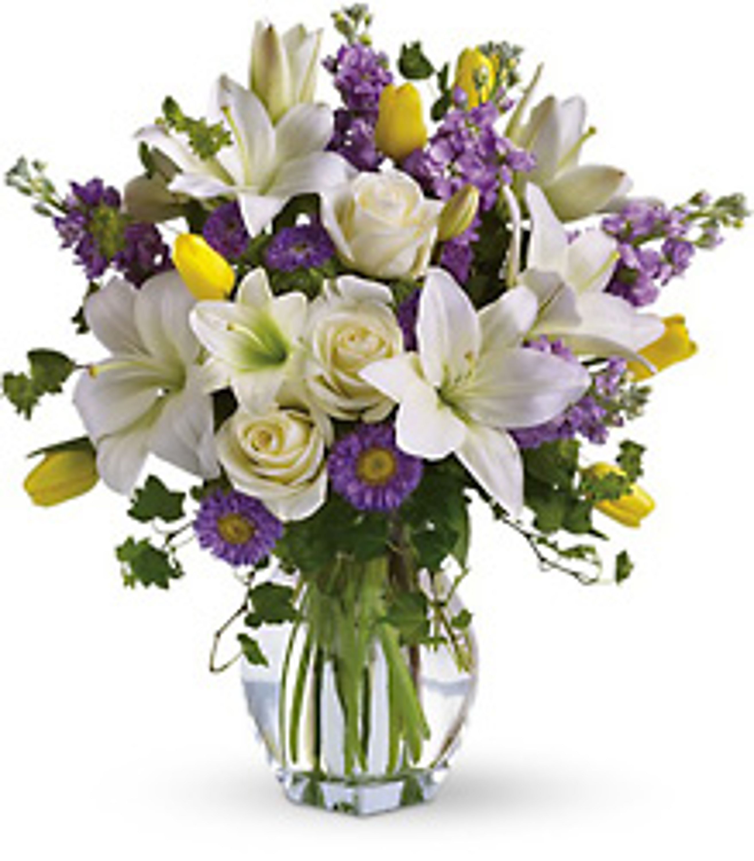 Graceful, elegant and timeless, this beautiful spring bouquet offers up colors, blossoms and textures in perfect harmony. SMALL 12 FLOWERS- MEDIUM 18 FLOWERS, LARGE 24 FLOWERS