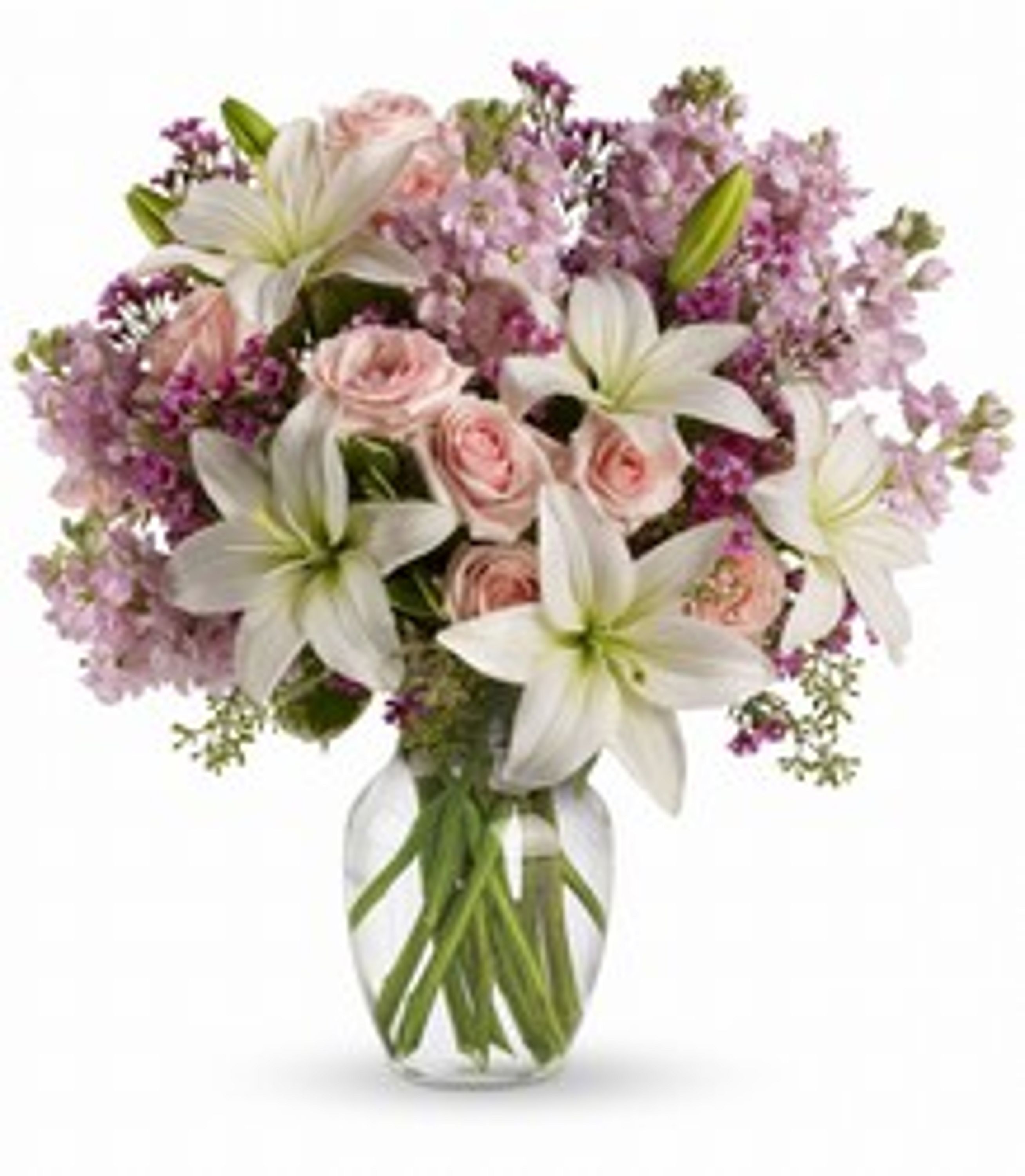 Think of someone you love. Then think how thrilled they'll be when this gorgeous bouquet arrives at the door. Light pink spray roses, fragrant white lilies and other favorites in a sparkling glass vase – they'll be floating on air all week. SMALL 12 FLOWERS- MEDIUM 18 FLOWERS- LARGE 24 FLOWERS