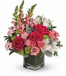 Fun and feminine, this hot pink bouquet is reminiscent of a spring garden party with friends! Stunning roses, delicate alstroemeria and dramatic snapdragons are hand-delivered in a classic cube vase lined with a green leaf - a surprise gift that'll touch her heart, no matter the occasion. SMALL 12 FLOWERS- MEDIUM 18 FLOWERS- LARGE 24 FLOWERS