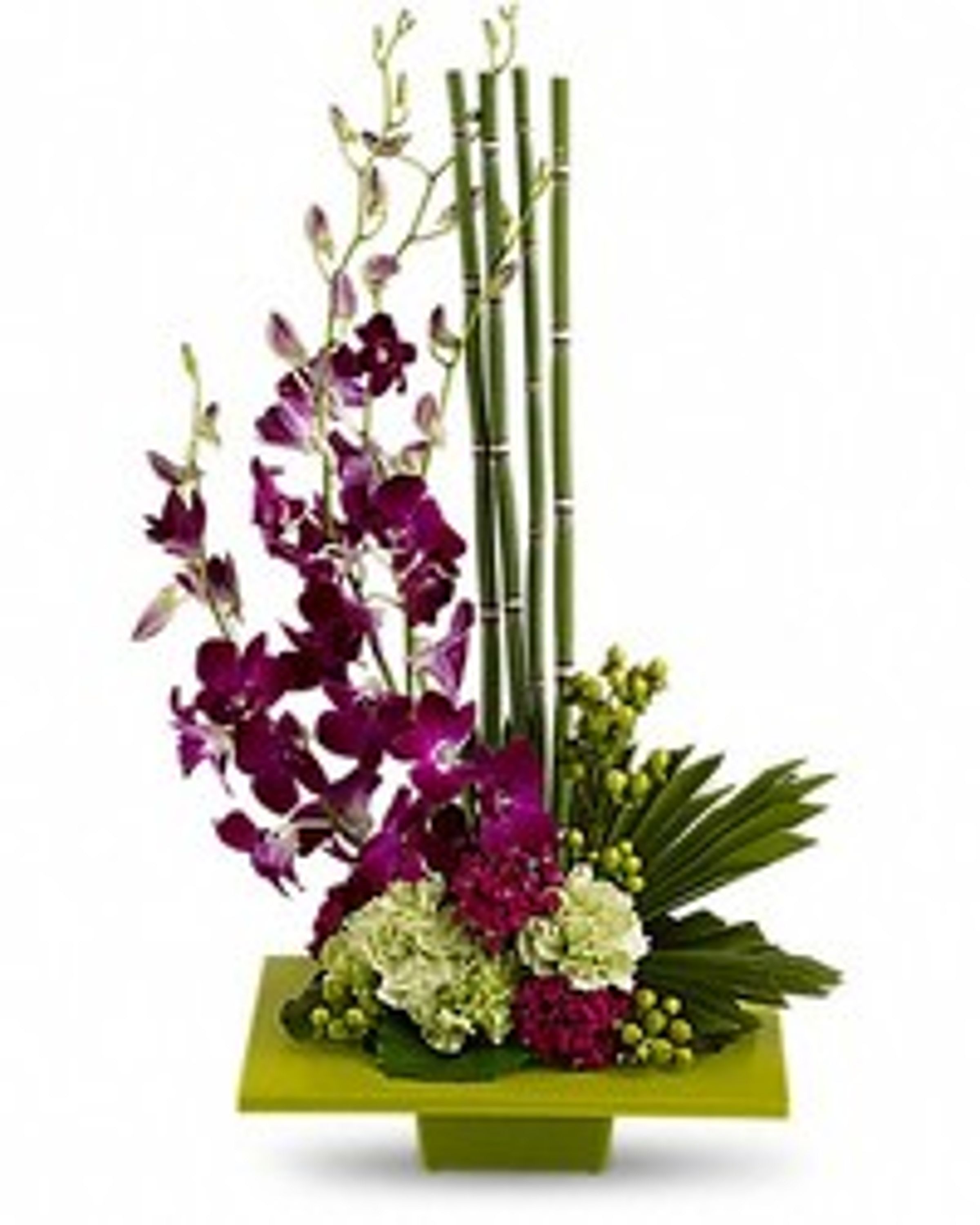 Looking more like modern sculpture than a floral arrangement, this striking bouquet surprises with delicate purple orchids, mini bamboo and a colorful mix of blooms - sure to improve any room's feng shui. SMALL- 5 ORCHIDS MEDIUM- 10 ORCHIDS LARGE- 20 ORCHIDS