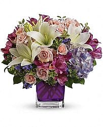 Va-va-bloom! This grand array of purple hydrangea, light pink spray roses and white asiatic lilies is presented in our violet cube.