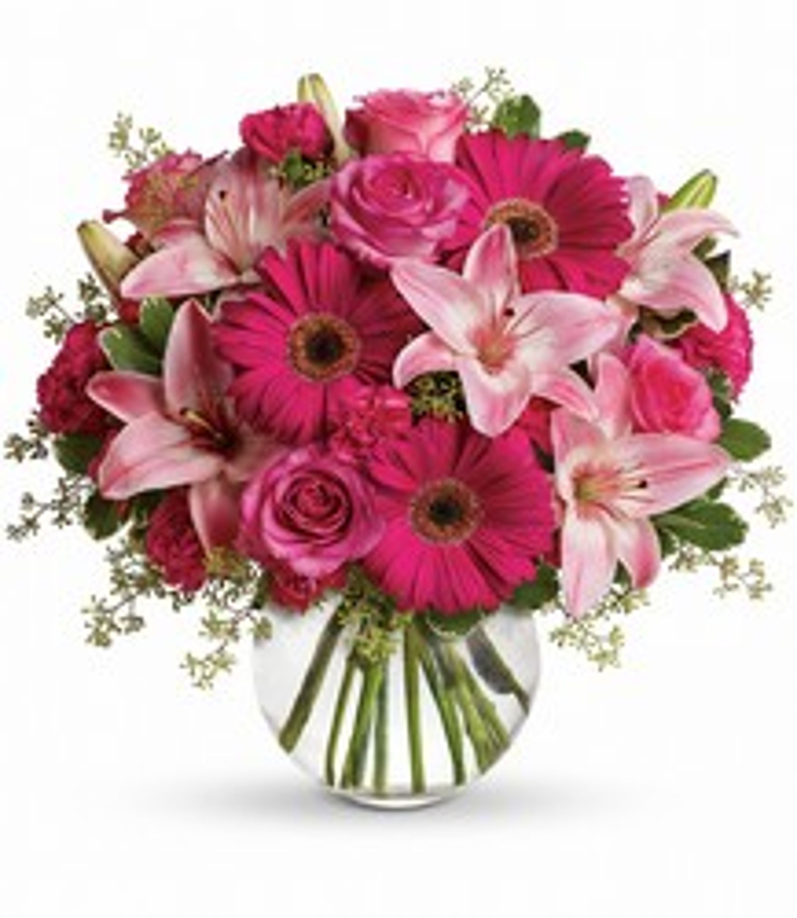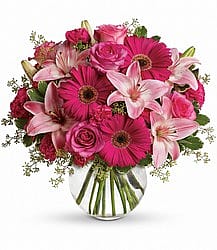 Youthful. Graceful. Beautiful. These are just a few qualities that come to mind when gazing at a gorgeous bouquet of pink flowers. Whether you want this arrangement to say Happy Any Day, you can be sure the day it arrives will be brighter for anyone lucky enough to receive it. SMALL- 12 flowers MEDIUM- 18 flowers LARGE-24 flowers