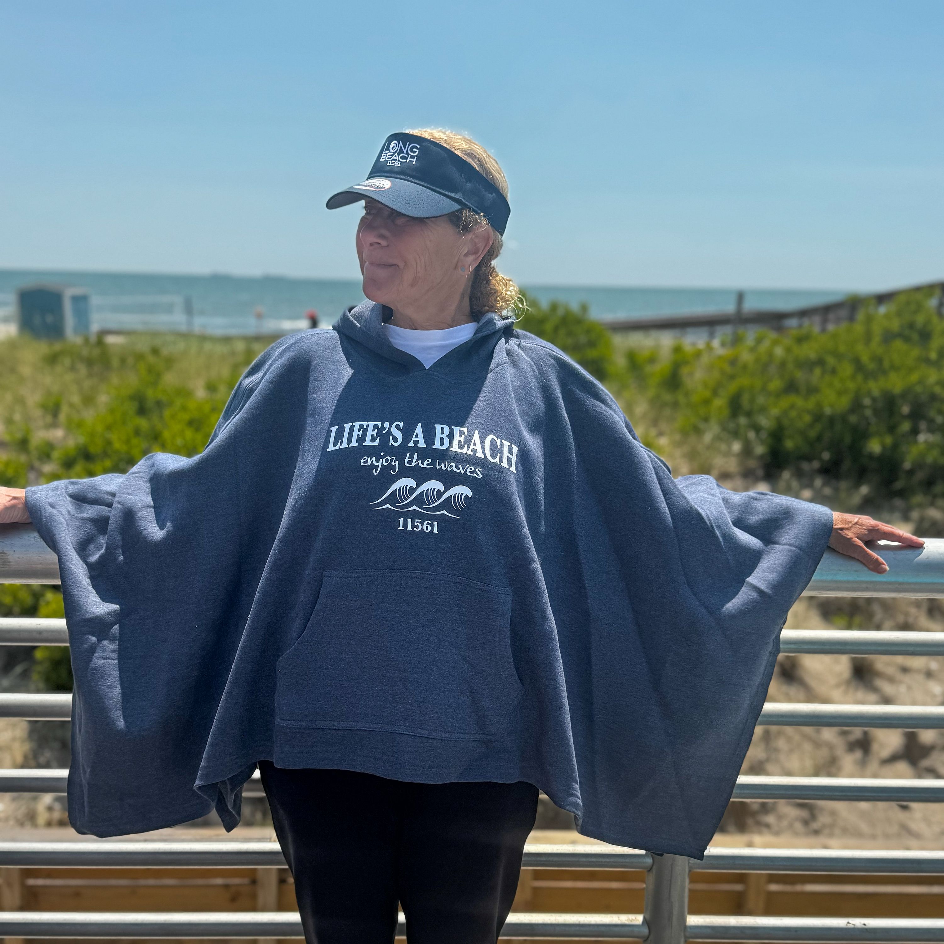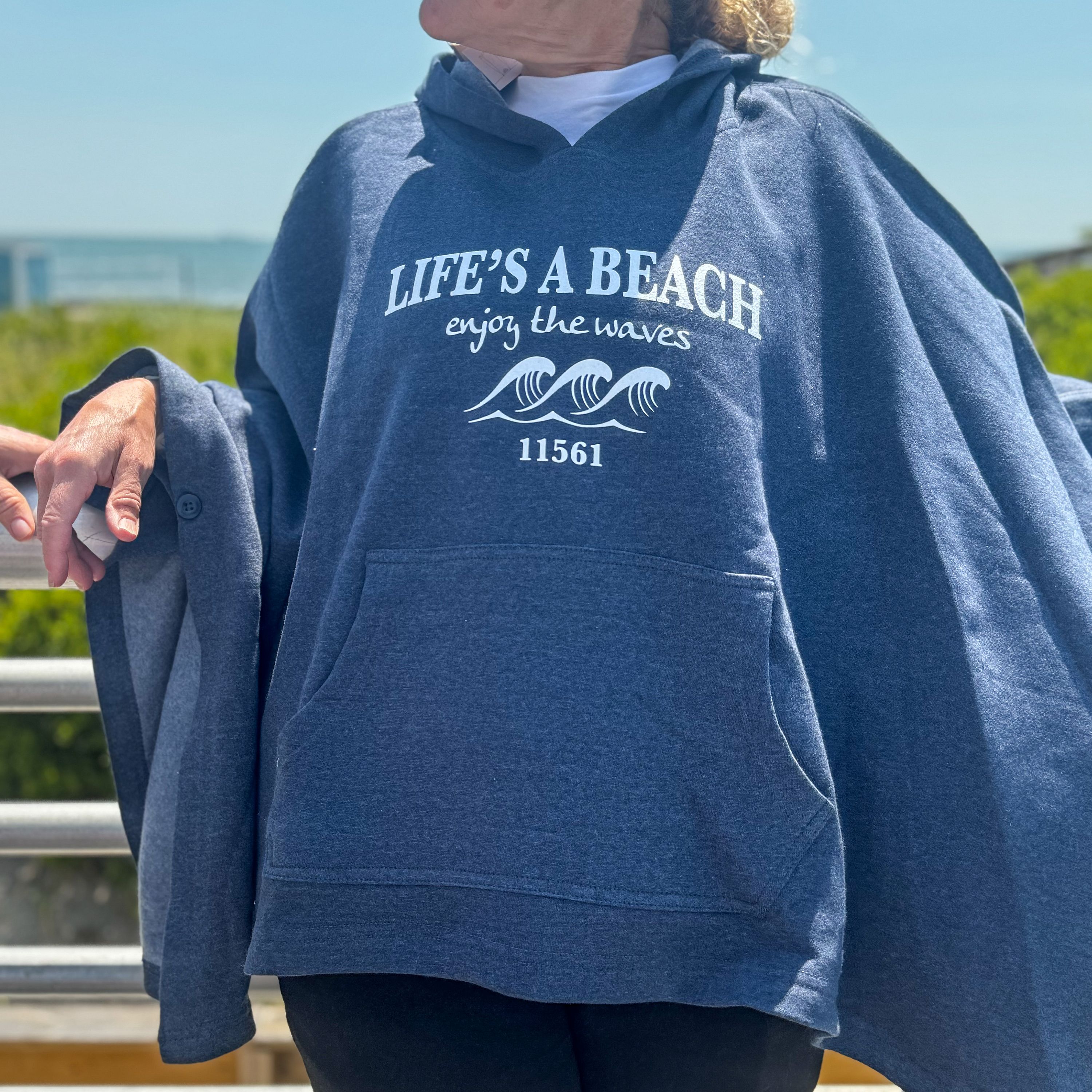 Life's A Beach, Enjoy The Waves. One size poncho hoodie. Color: Navy Heather Material: 55/45 cotton/polyester fleece. Features: Unlined hood. Front pouch pocket. Button tacked at armholes #lisubscriptionbox