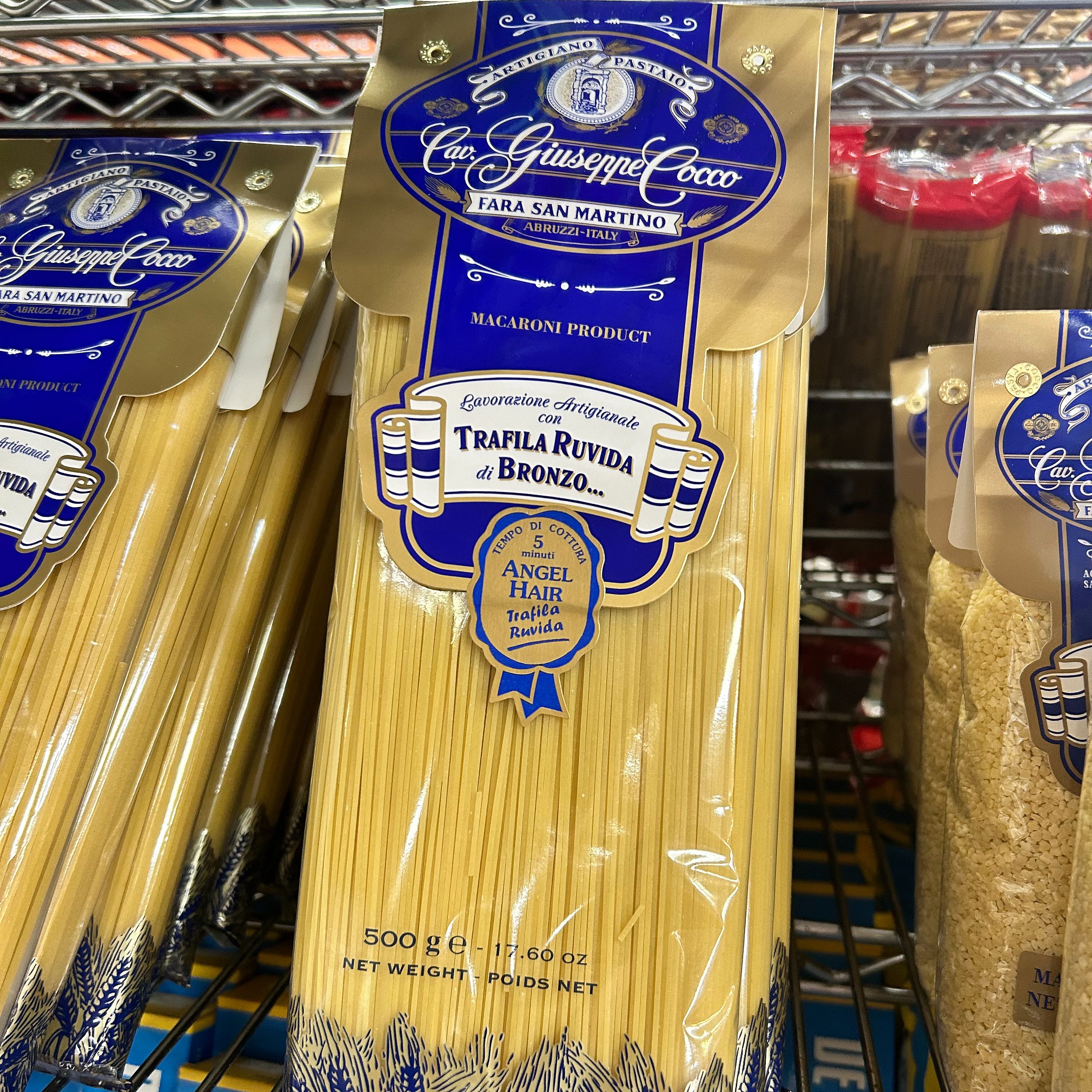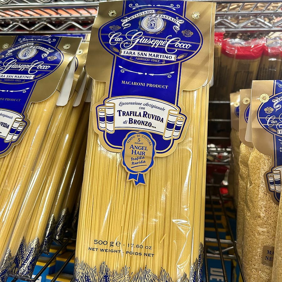 Cav. Giuseppe Cocco Angel Hair is a tradition artisanal pasta is crafted from premium durum wheat semolina and cold pure spring water. This pasta is cut with a rough bronze die, which creates a slightly rough surface that helps sauces cling to the noodles.