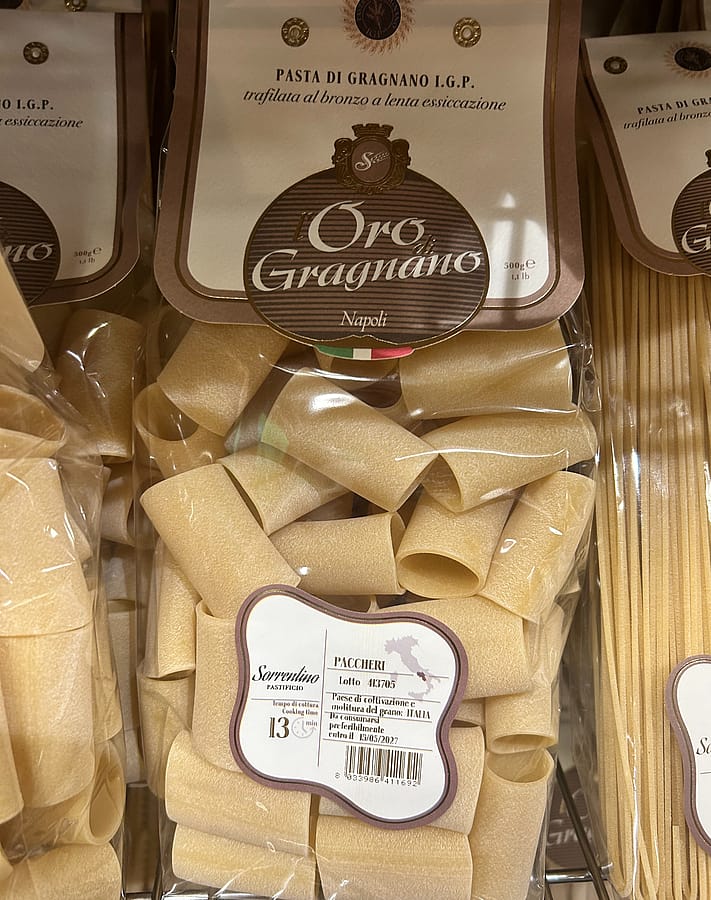 Oro Di Gragnano Paccheri is an authentic hollow tube-shaped pasta made from 100% Duram wheat. The bronze-cut surface and generous shape ensure your favorite sauces cling beautifully to the pasta.