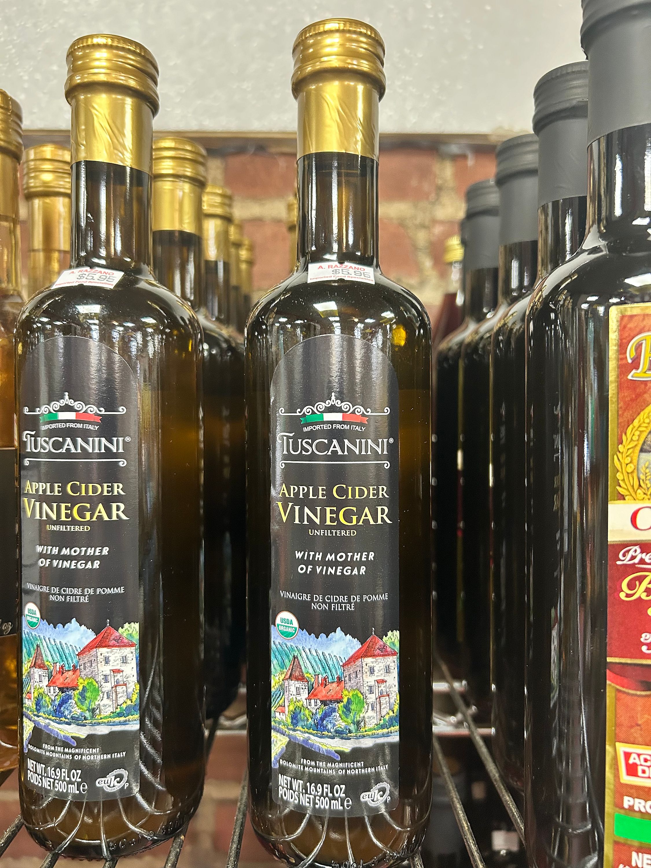 Tuscanini Apple Cider Vinegar is an Italian premium, organic, and unfiltered apple cider vinegar. wonderful sour note with a slight hint of apples to your dishes. Its subtly sweet and sharply acidic character enhances culinary creations.