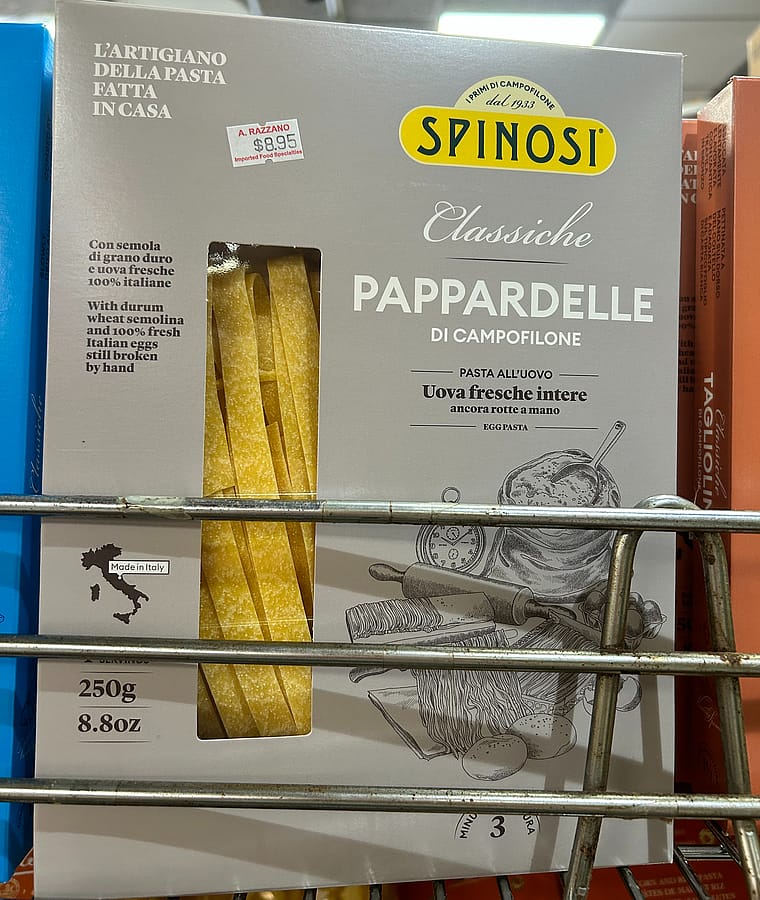 Indulge in the rich tradition Italian artisan parta with Spinosi Di Campofilone, a luxurious ribbon-style egg pasta handcrafted in Italy. Made with only two ingredients durum wheat semolina and 33% fresh whole eggs from free-range hens- this pasta contains no added water, ensuring a silky, rich flavor and firm texture.
