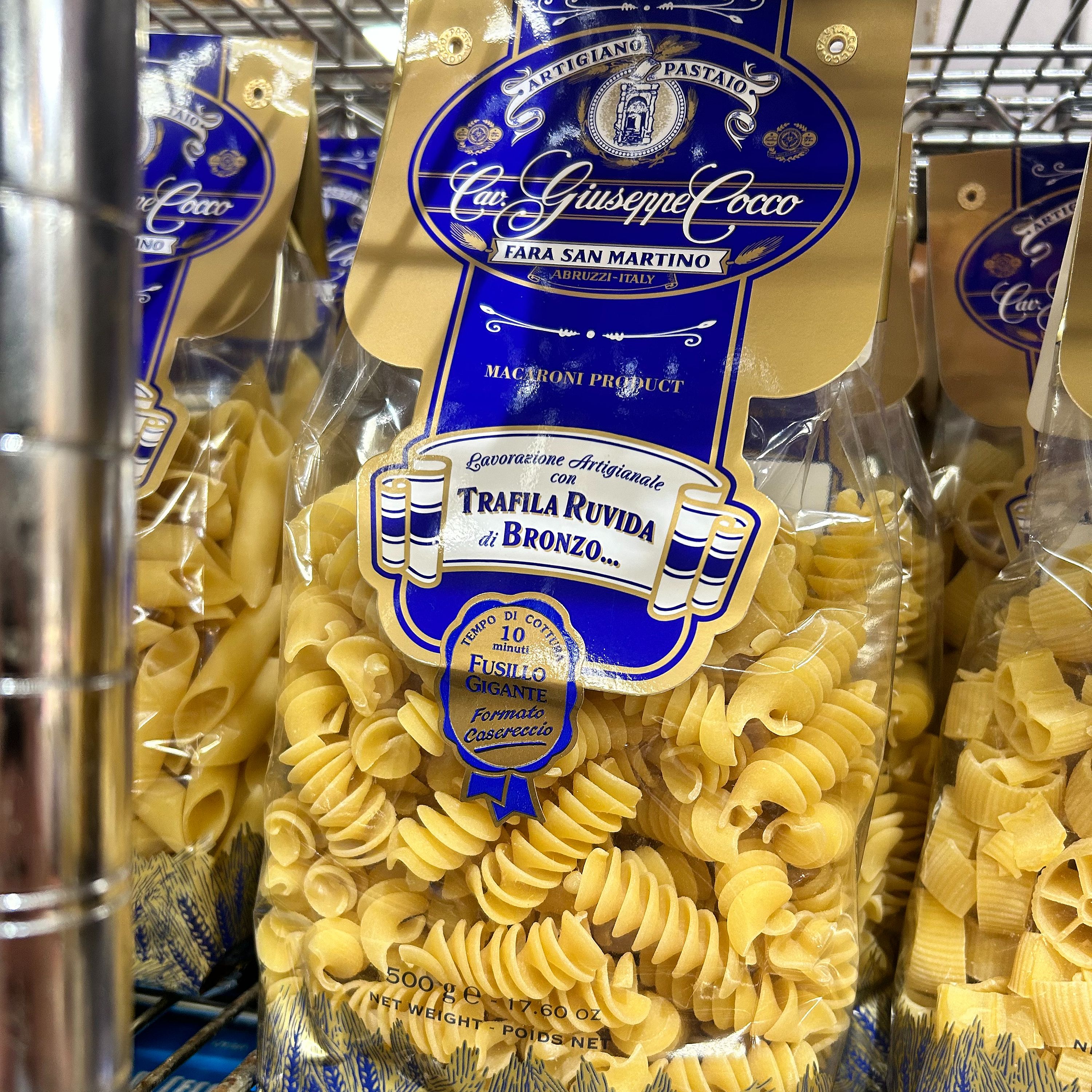 Traditional Fusilli Gigante pasta by Cav. Giuseppe Cocco, using high-quality durum wheat semolina and bronze dies for a rustic texture that holds sauce beautifully. The oversized spiral shape makes it perfect for heart sauces and baked dishes.