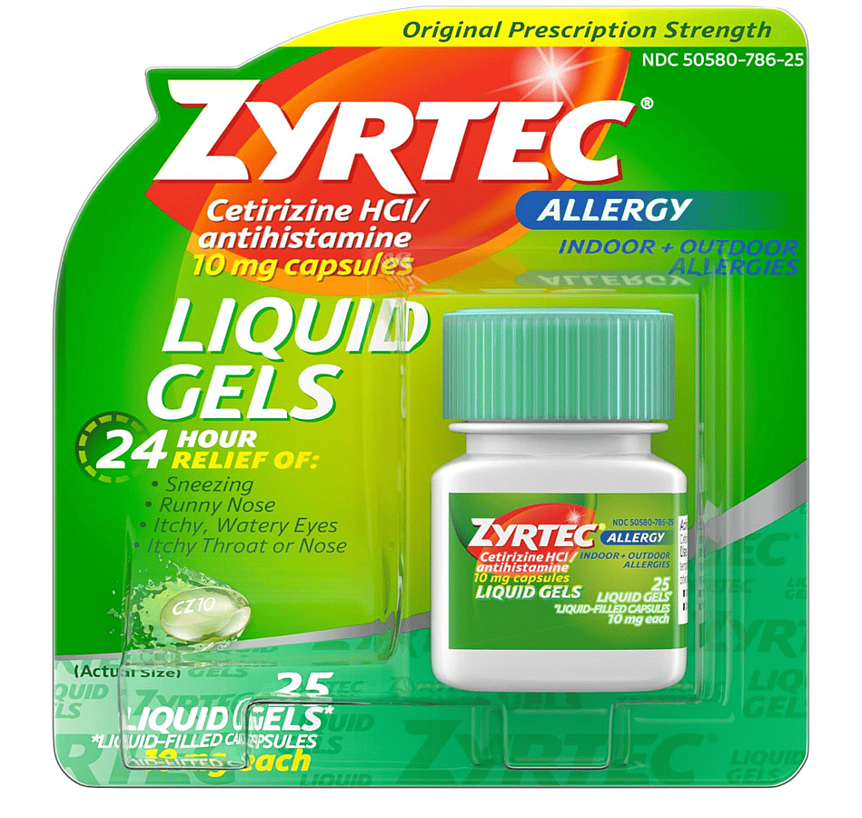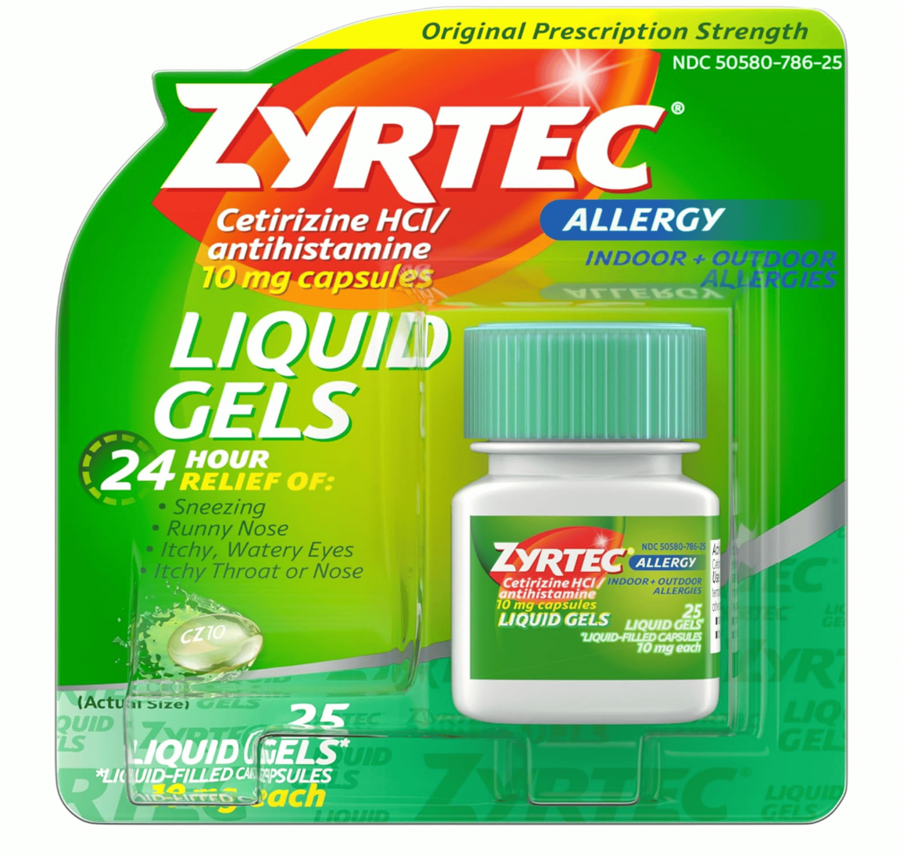 Zyrtec Allergy Liquid Gels provide 24-hour relief from indoor and outdoor allergy symptoms with fast-acting, liquid-filled capsules. Each softgel contains 10 mg of cetirizine HCl, a second-generation antihistamine known for being effective and non-drowsy in most users.
