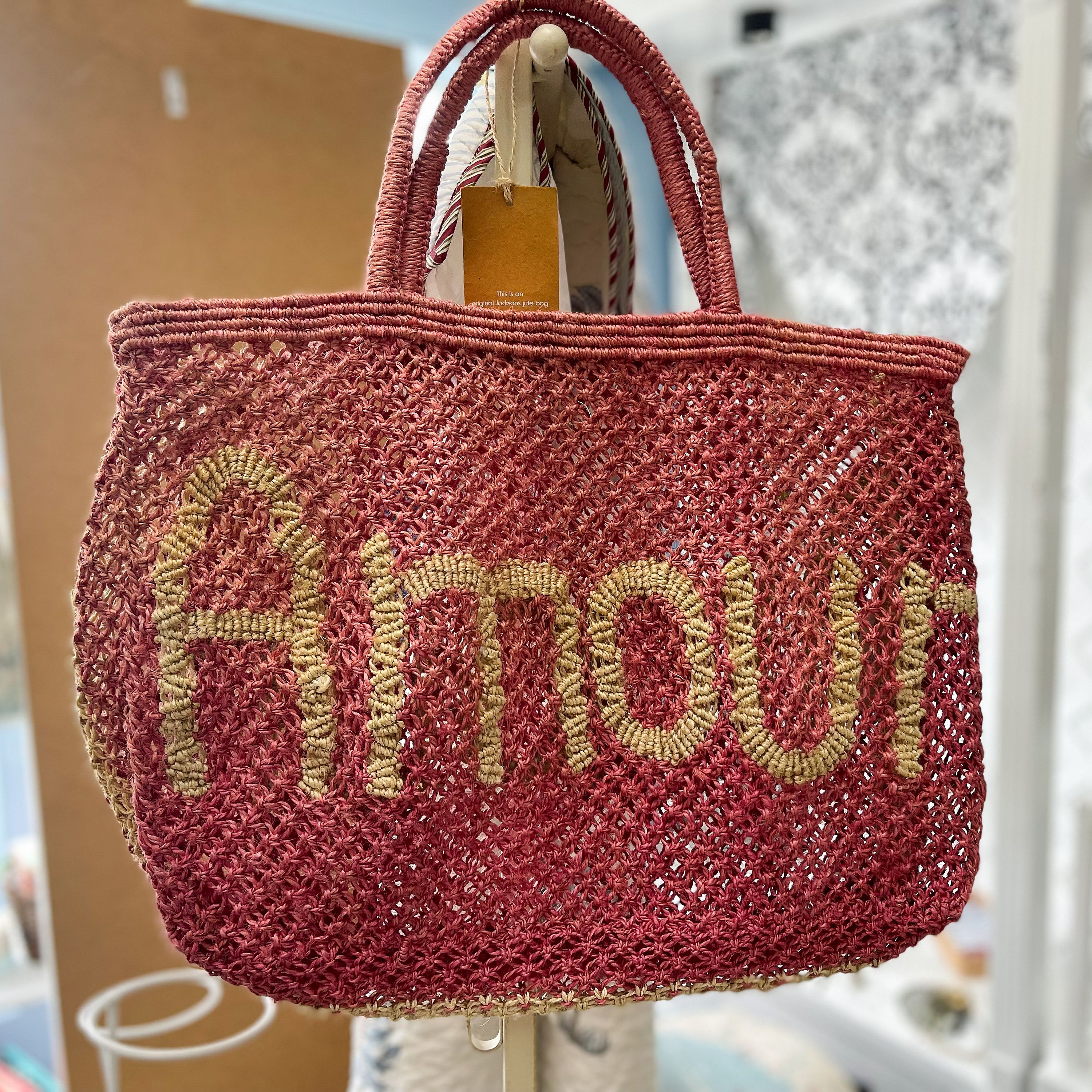 This charming woven "Amour" tote bag brings playful elegance to your daily carry. Handcrafted in a pink hue, it features natural-colored "amour" lettering across the front-French for "love". With its textured, open-weave construction and sturdy double handles, this bag is as function as it is eye-catching. Ideal for beach trips, brunch outings, shopping days, or bridal gifts, its roomy enough for you everyday essentials and effortlessly stylish for any occasion.