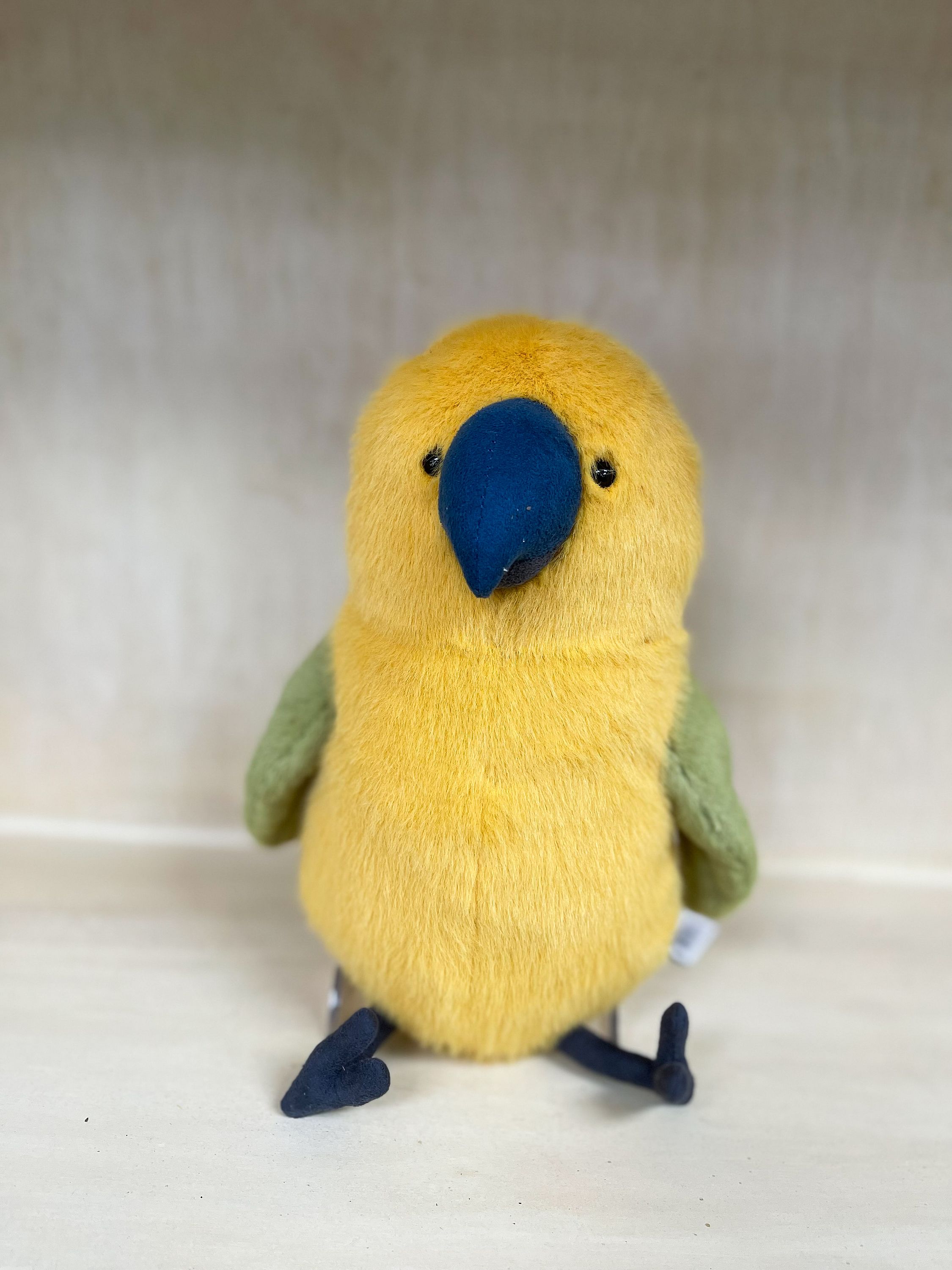 Bursting with tropical charm, this cheerful plush features a bright yellow body, soft blue beak, and quirky corduroy feet. Extraordinaire, sun seeker and all round beach lover with its stitched smile, and cheerful color palette, this parrot brings a burst of fun and friendliness to anyone.