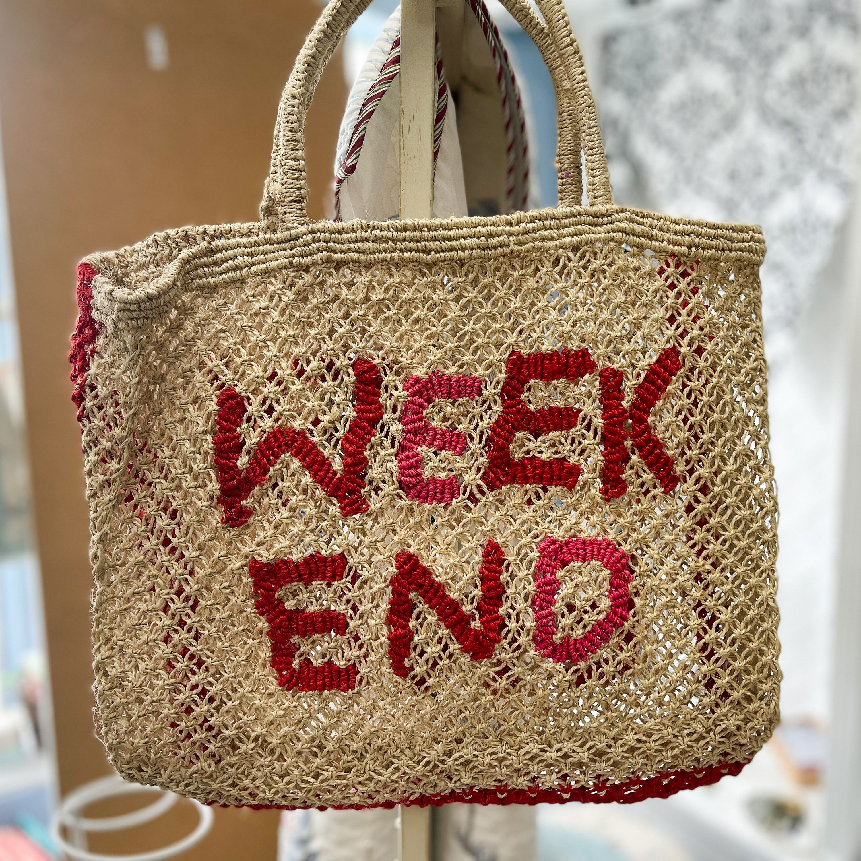 Meet your new favorite getaway companion, a handmade jute bag with Weekend written on both sides in Berry. Jute is tightly woven so your items will not fall through making this useful as an everyday bag, beach bag or sightseeing.