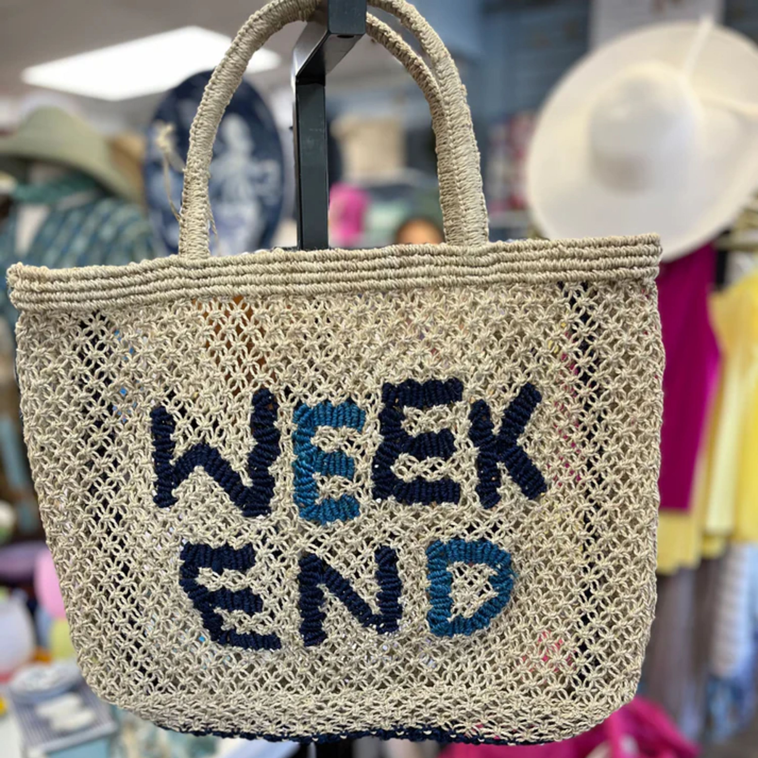 -Handwoven Jute bag with Weekend written in blue on both size.