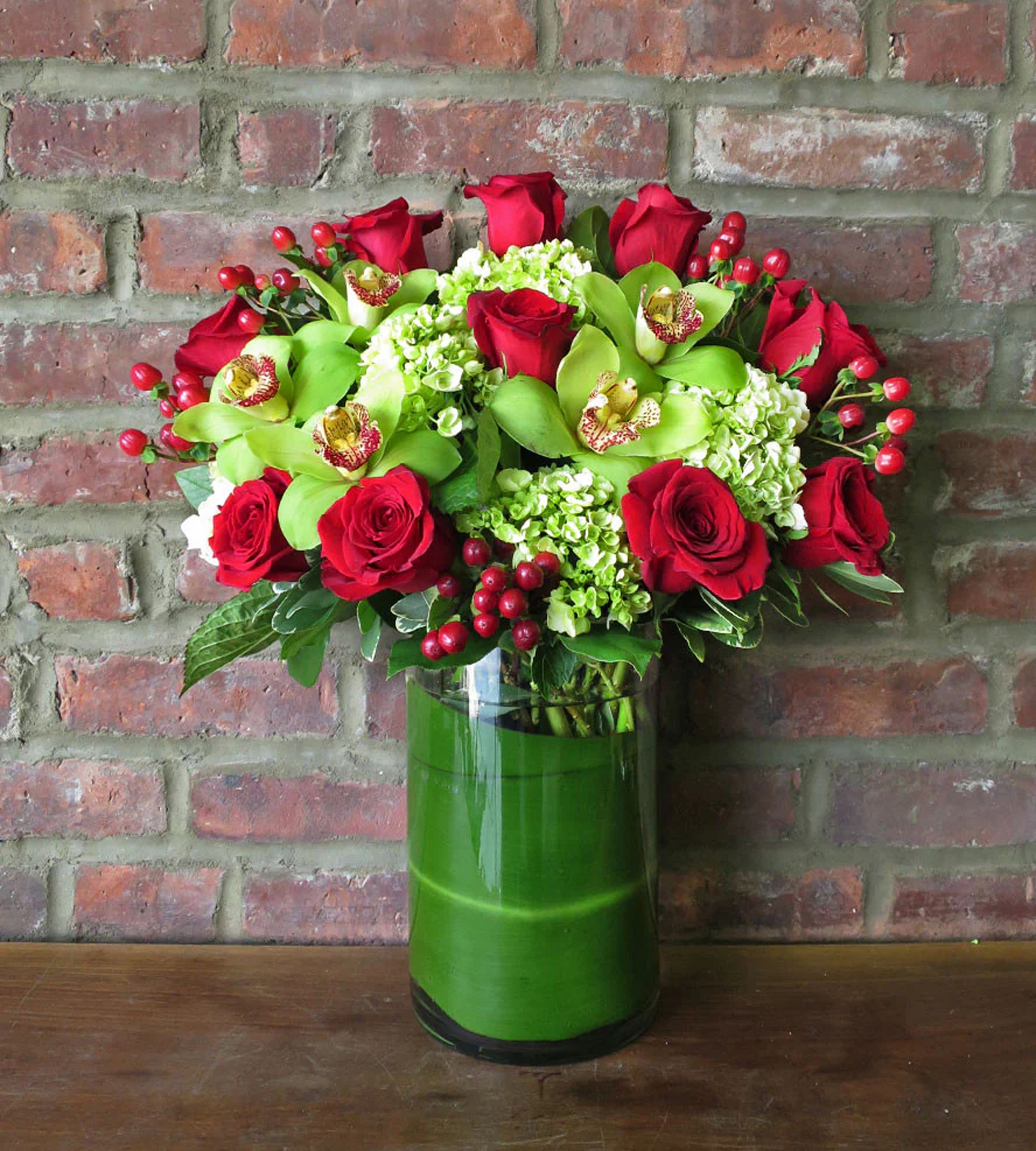 Filled with red roses, green hydrangea, green orchids, and red berries, she's sure to know what a smooth criminal you are.