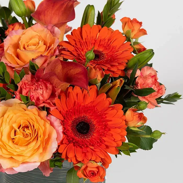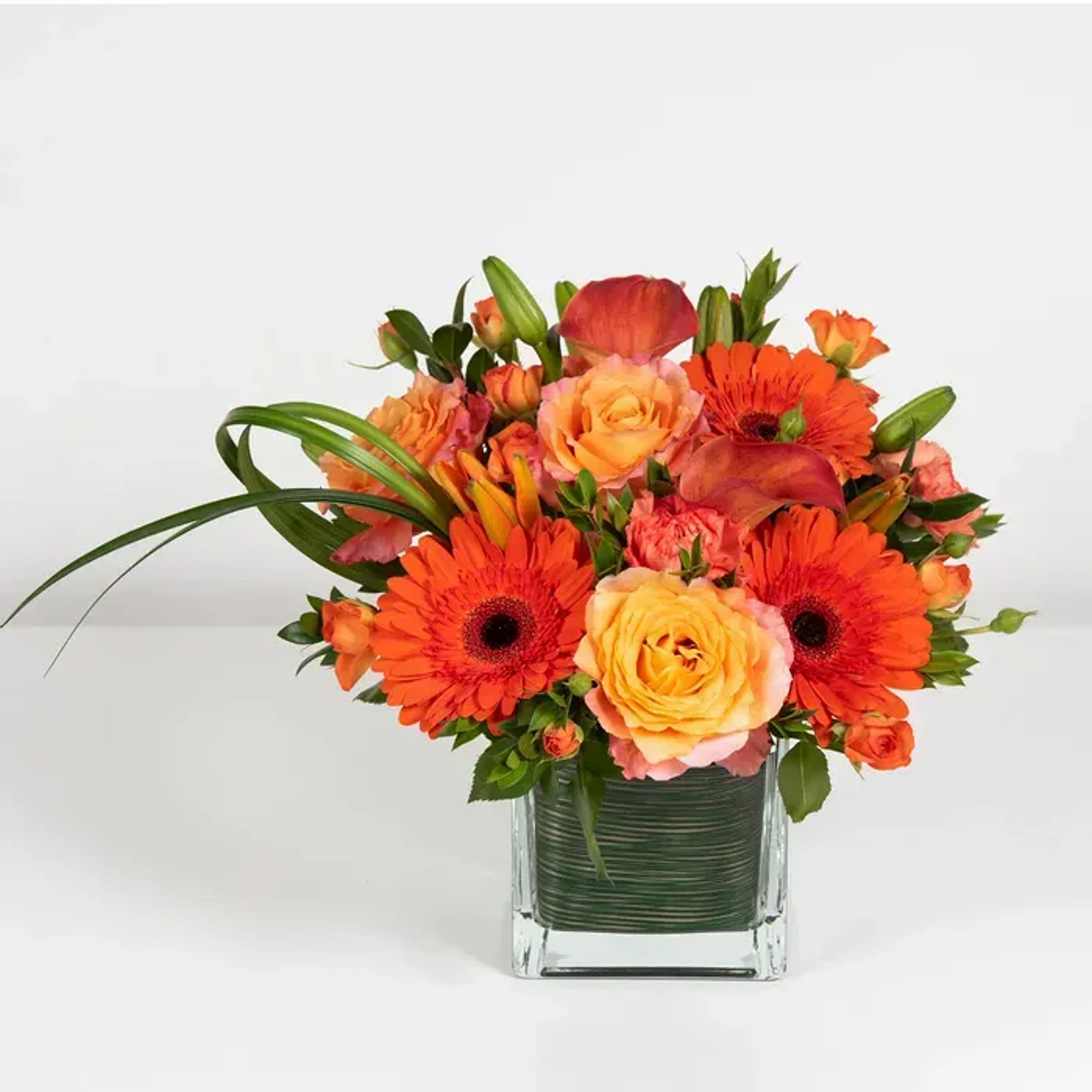 Brighten someone's day with this arrangement featuring roses, mix orange flowers, gerbera daisies.