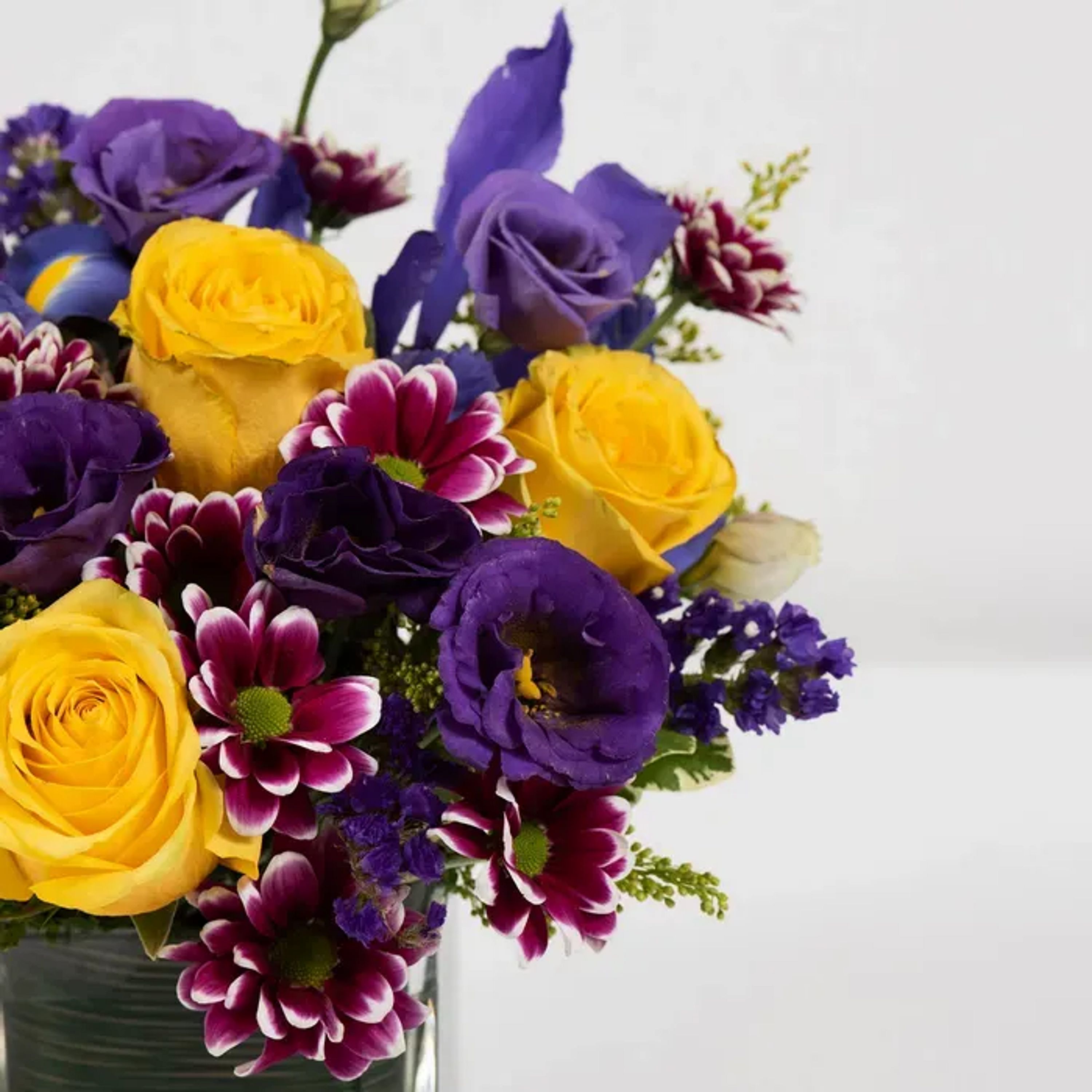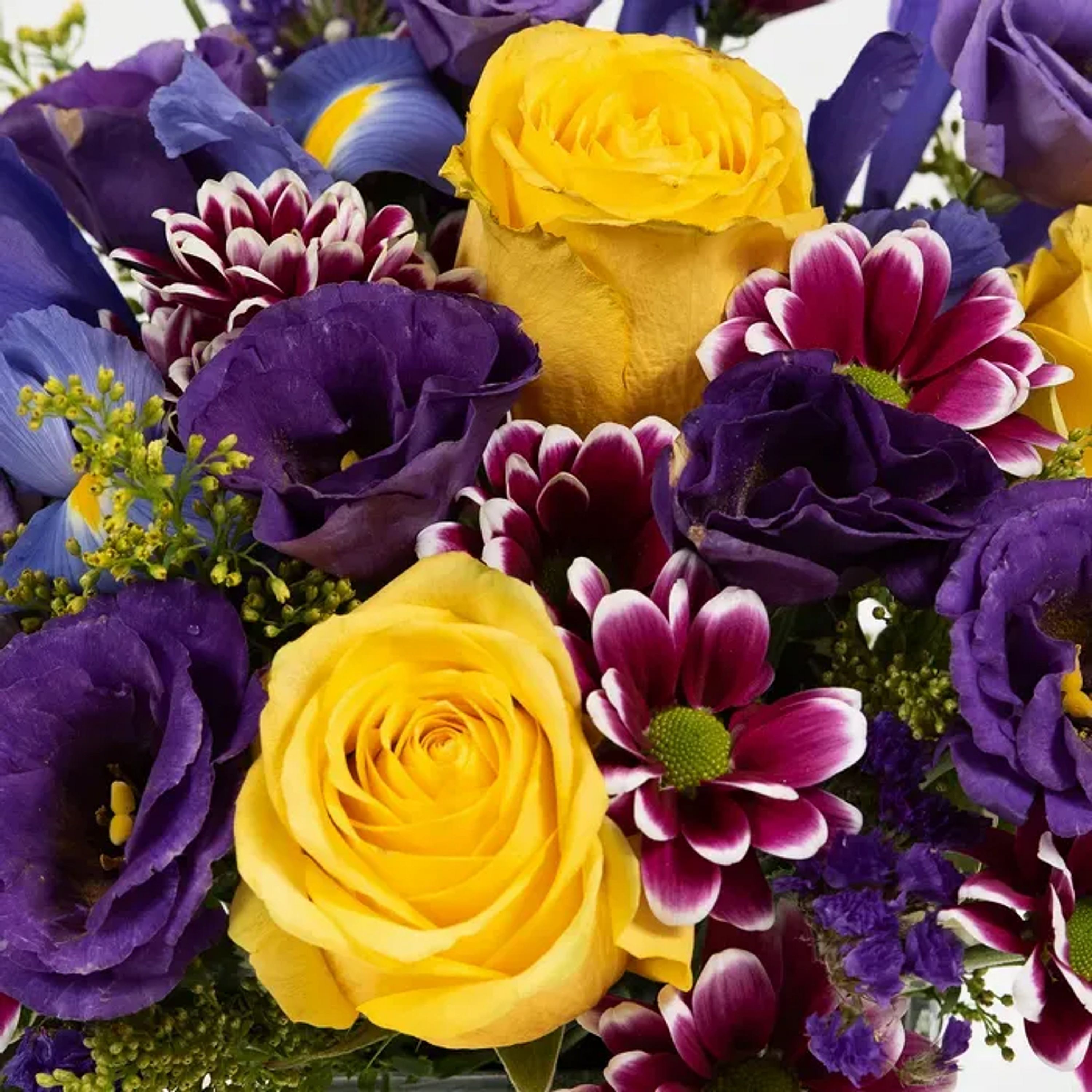 Let the good times roll with this bold and exotic arrangement of lisianthus, mums, roses, freesia, and statice.