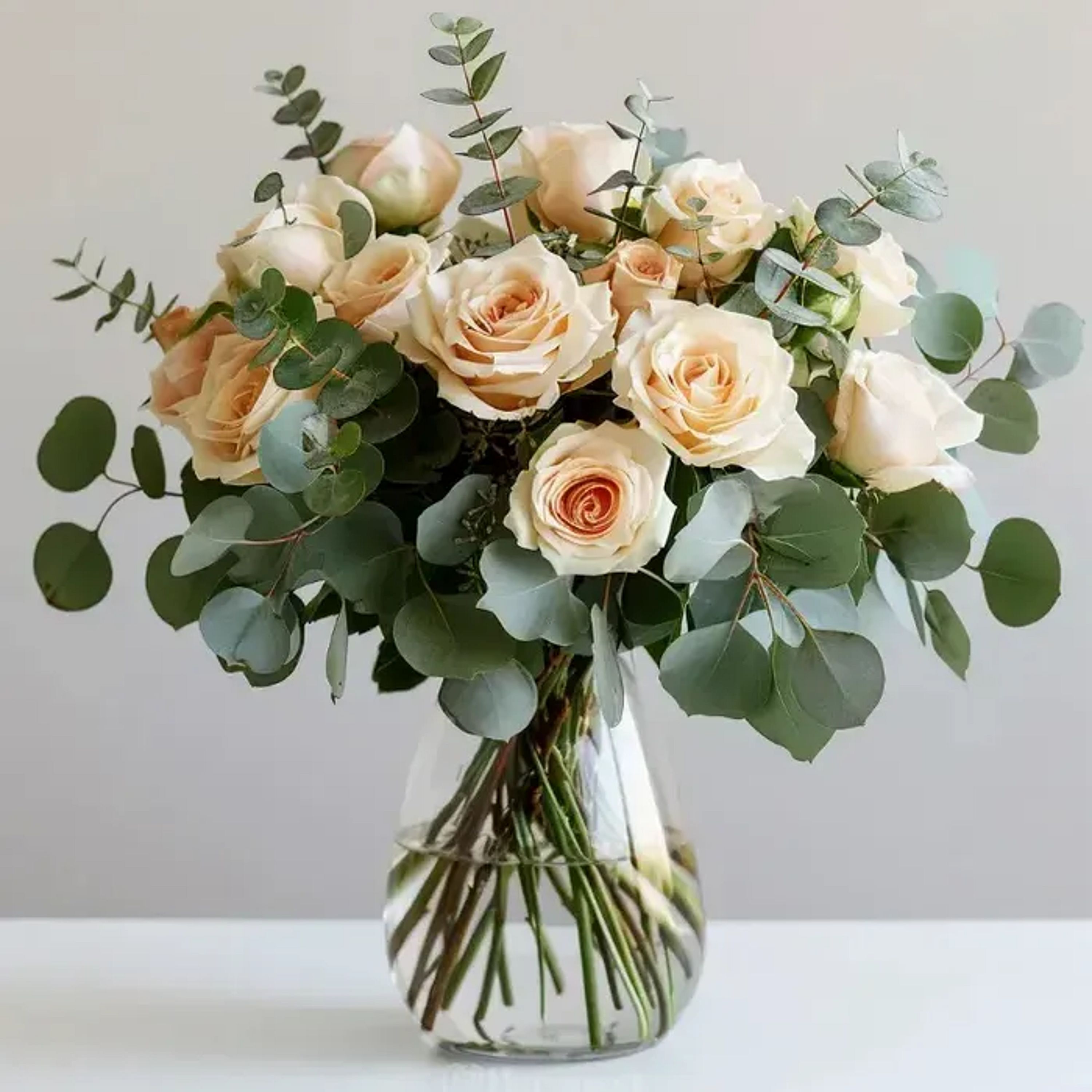 Spread love with this stunning light peach roses bouquet, full of mix eucalytus and greens.