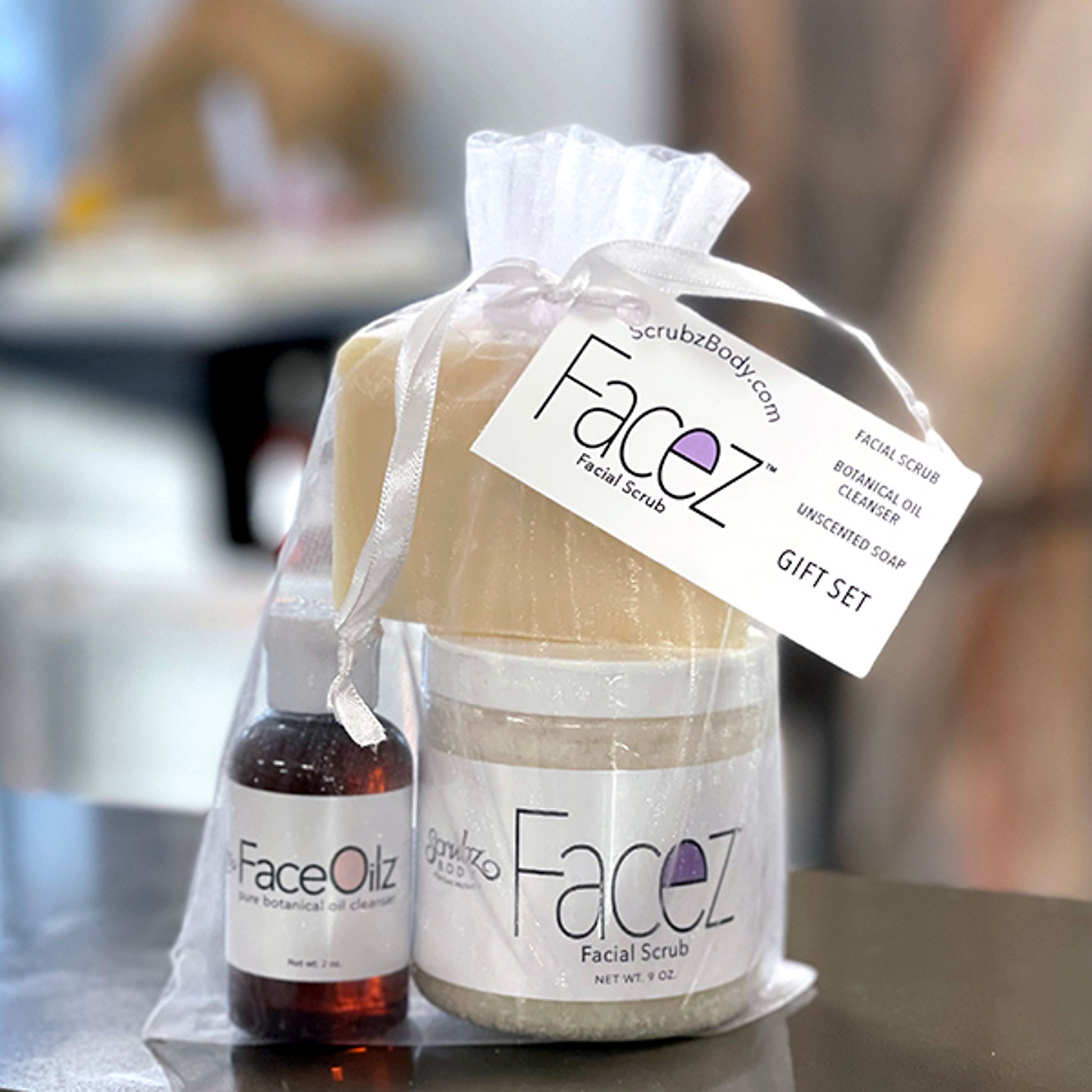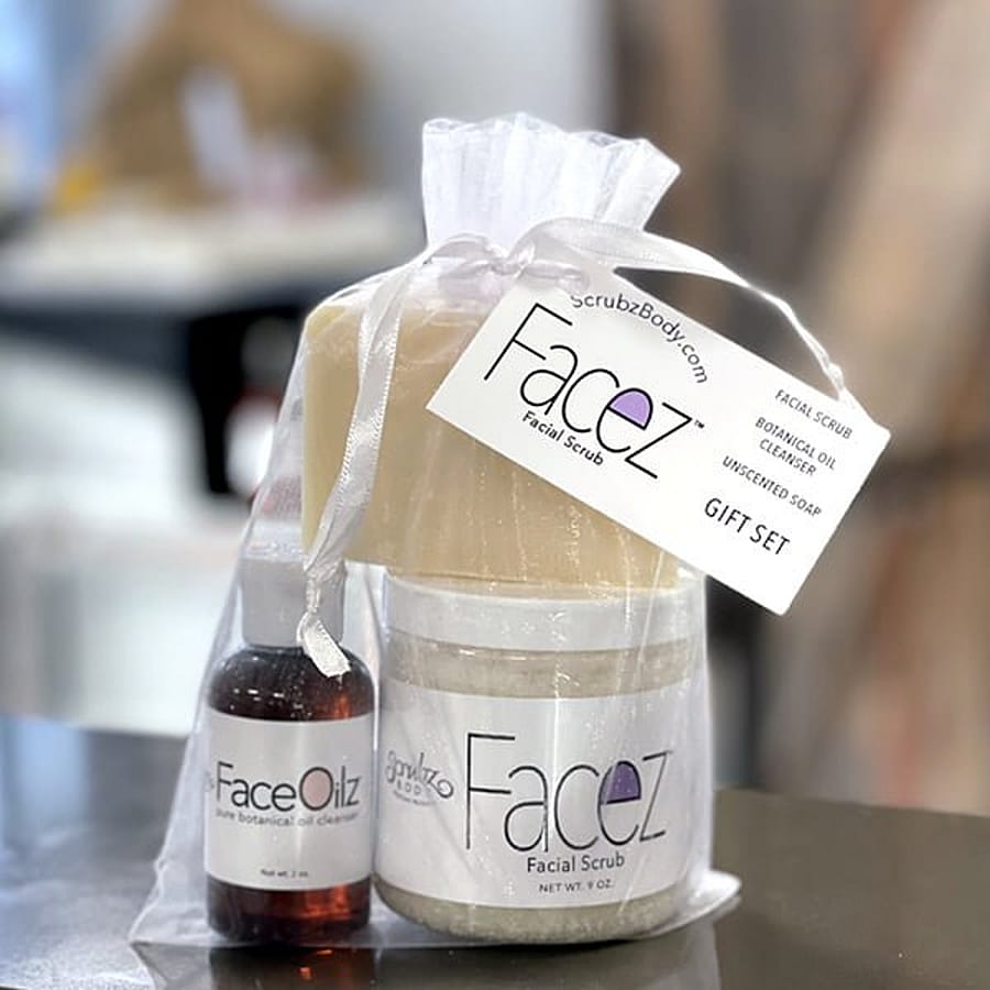 -Comes complete with the Facez Facial Scrub, Face Oilz Botanical Oil Cleanser, and Unscented Soap.