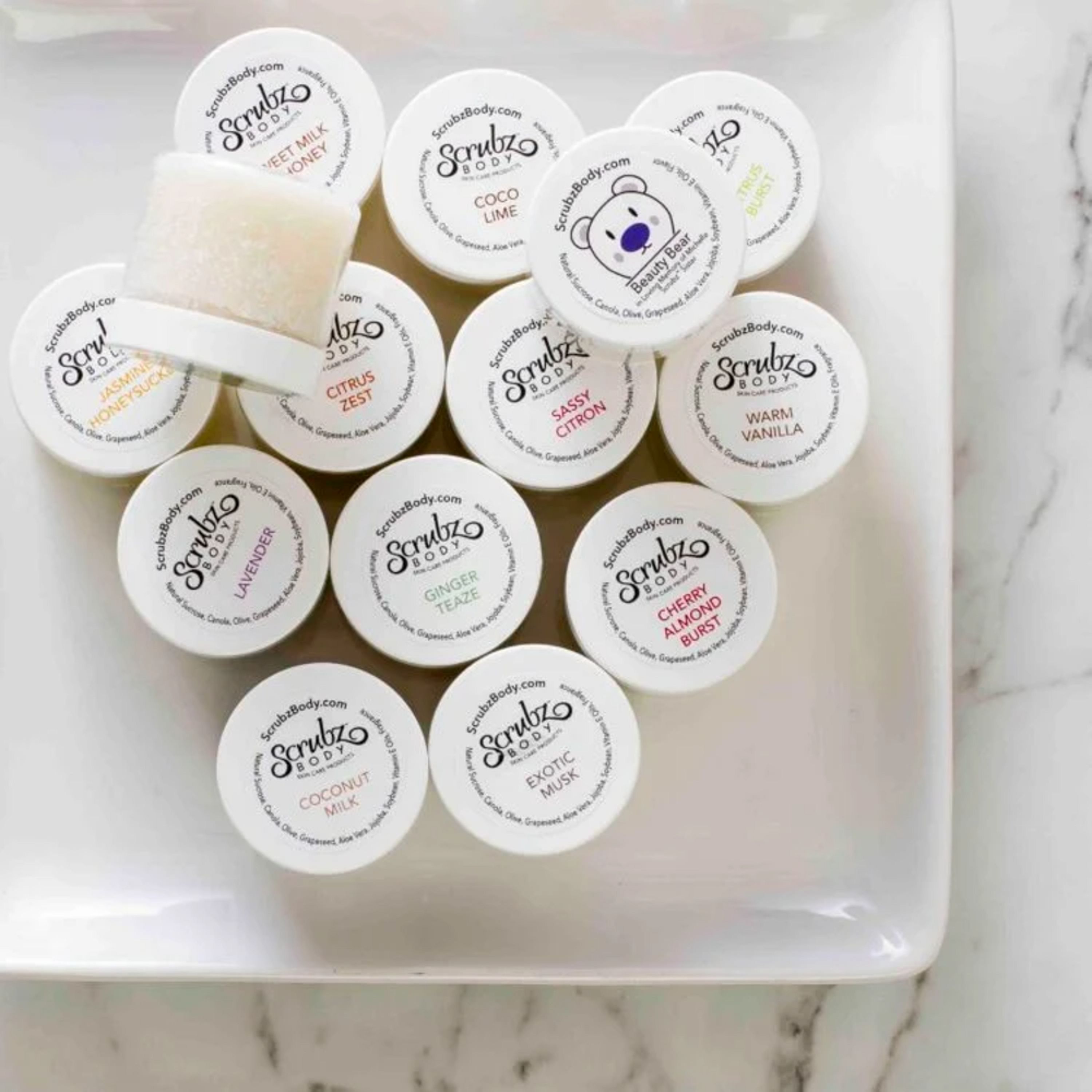 ScrubzBody Sugar Scrub in our 14-scent sample kit, plus other sample sizes of our most popular ScrubzBody products! #selfcare
